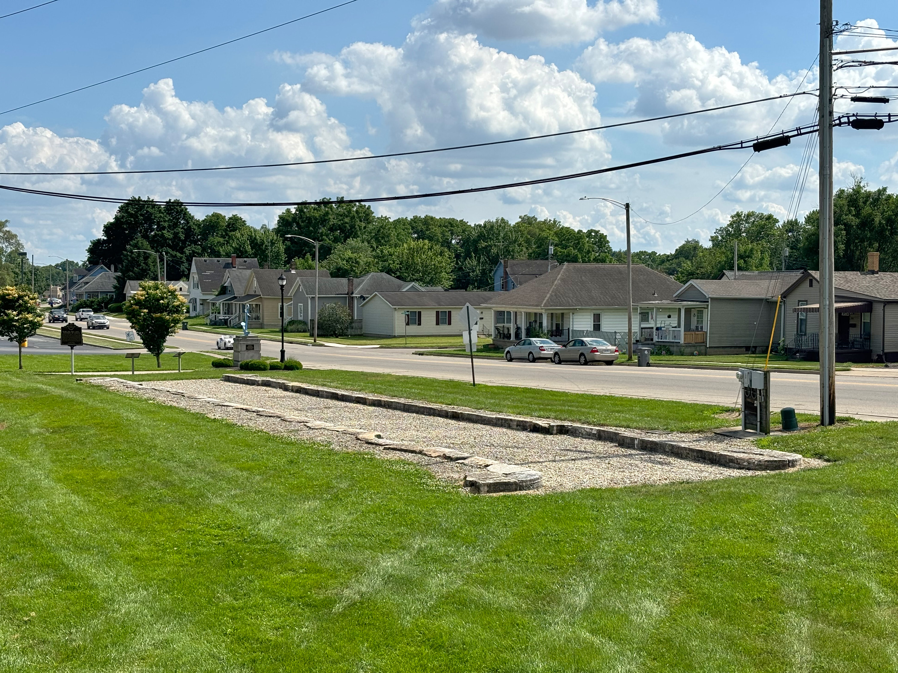 Another view of the reconstructed portion of Miami & Erie Canal lock #12 next to Elm Street and Atlantic Street, looking southwest from the Great Miami River Recreational Trail.