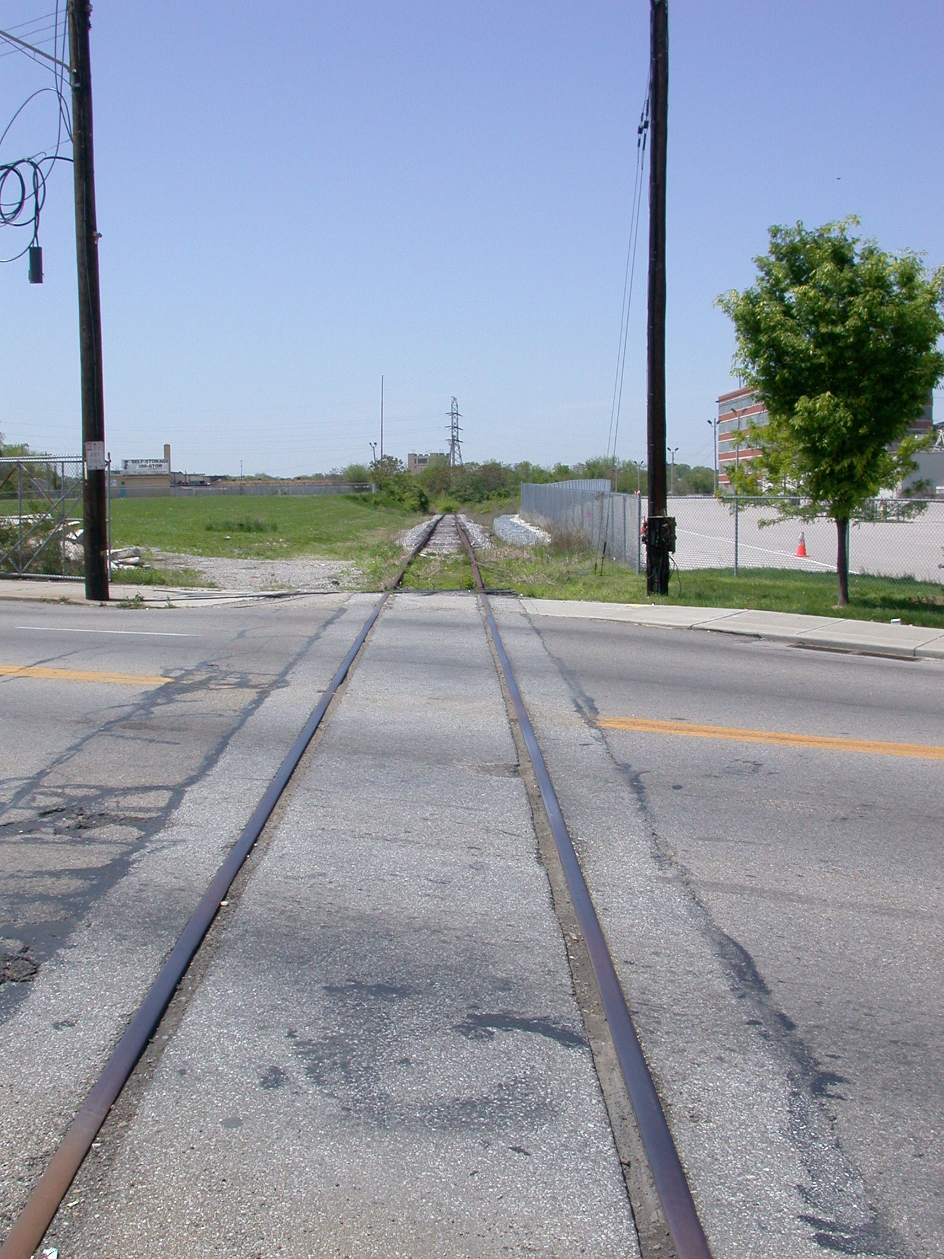 Abandoned N&W Hyde Park Branch track crossing Montgomery Avenue in Norwood, looking west. Though rebuilt a few years prior to this photograph being taken, this stretch of track hadn't been used for years. It has now been buried in the new University Station development, although the right-of-way is still open between the various parking lots, with the rails appearing once or twice in the crossing streets.