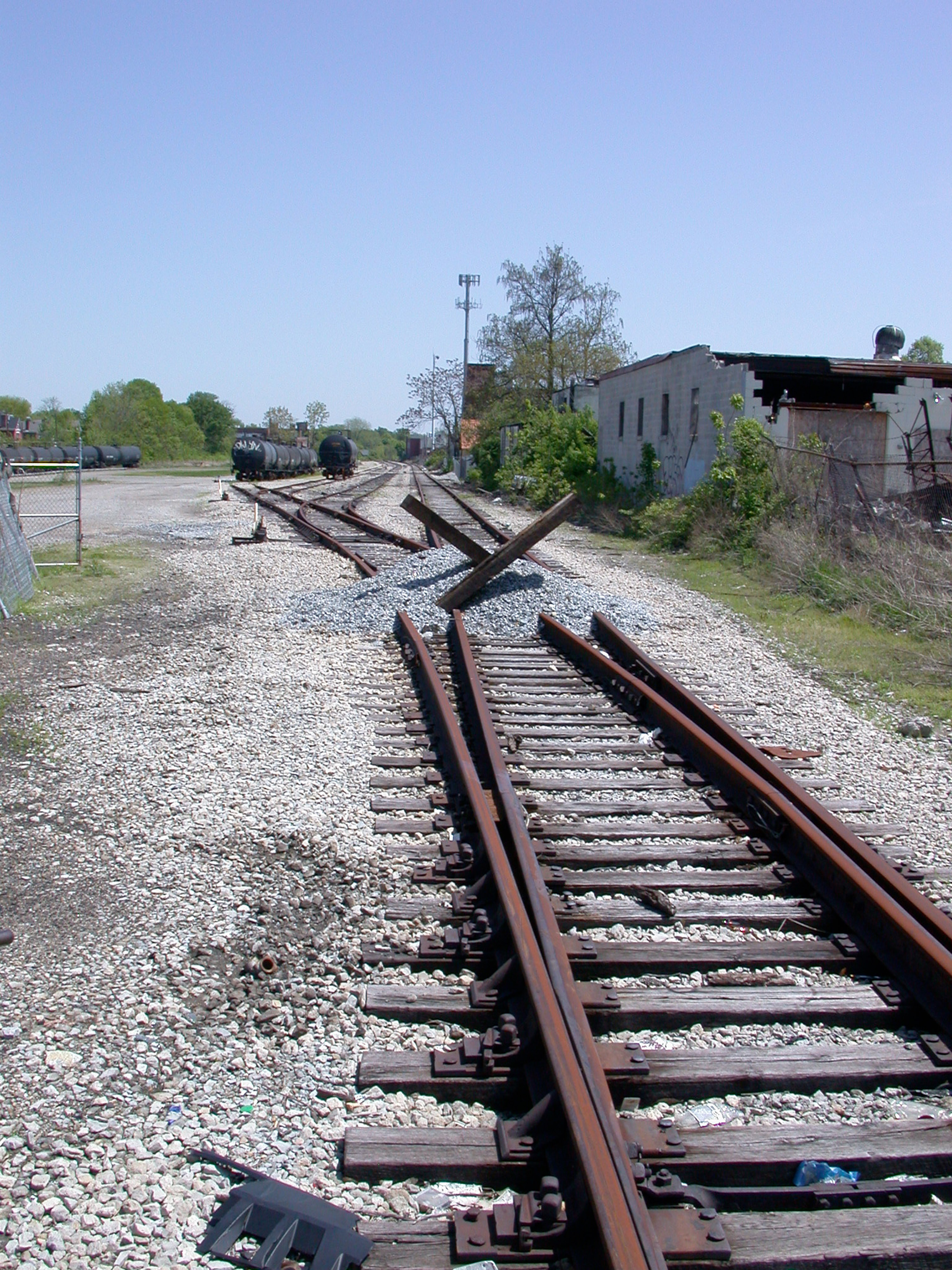 Abandoned N&W Hyde Park Branch track just east of the Montgomery Avenue crossing in Norwood, looking east into the small Idlewild Yard. The gravel and ties marked the end of active track. Now this is all completely abandoned. The old freight depot in the next couple photos was on the left between the tanker cars.