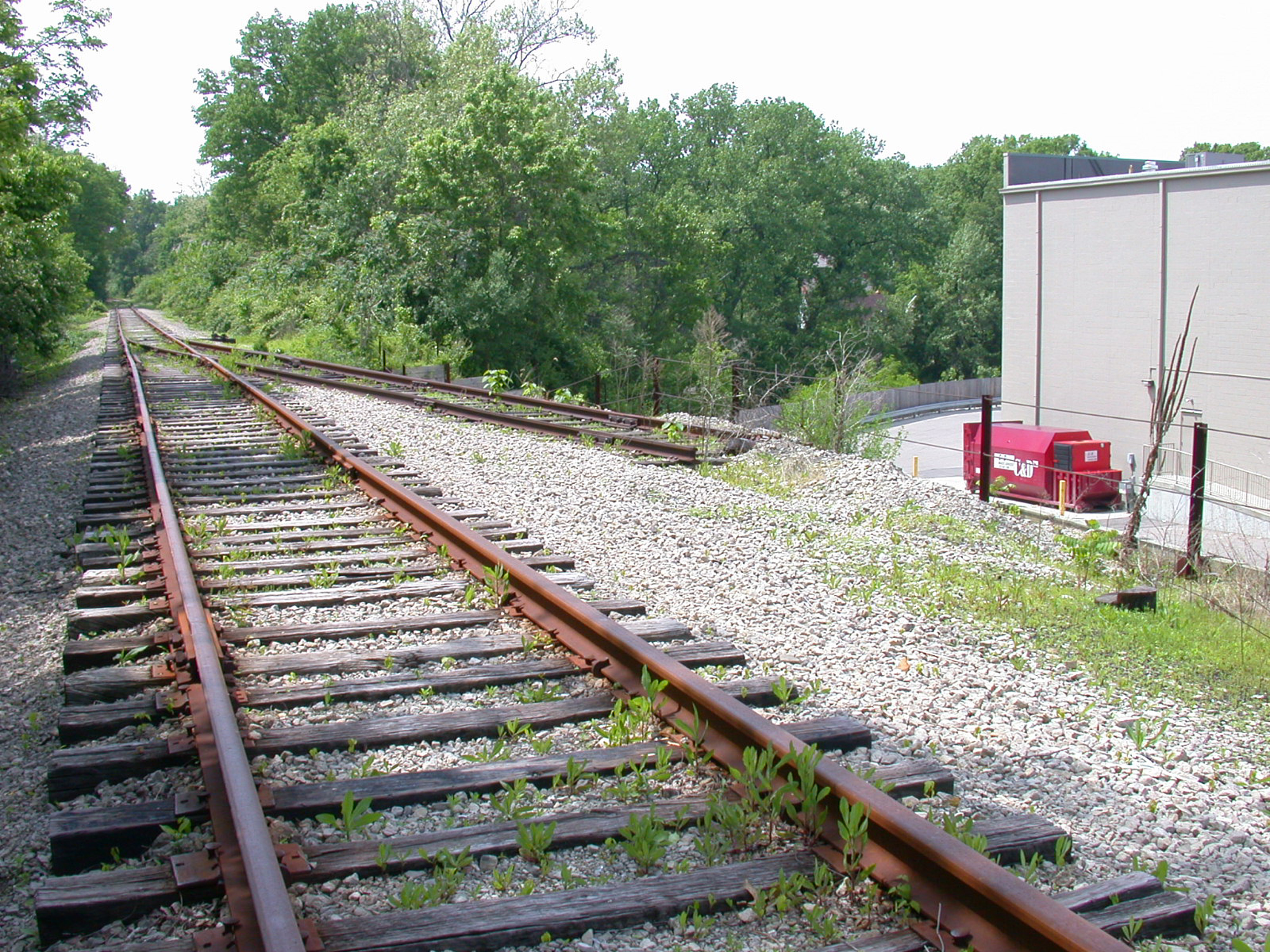N&W Hyde Park Branch track along the southern edge of Rookwood Commons at Stettinius Avenue, looking west. The severed spur track once led to Hyde Park Lumber and the LeBlond Machine Tools factories that have since been replaced by upscale retail. All this track has since been removed for the Wasson Way bike path.
