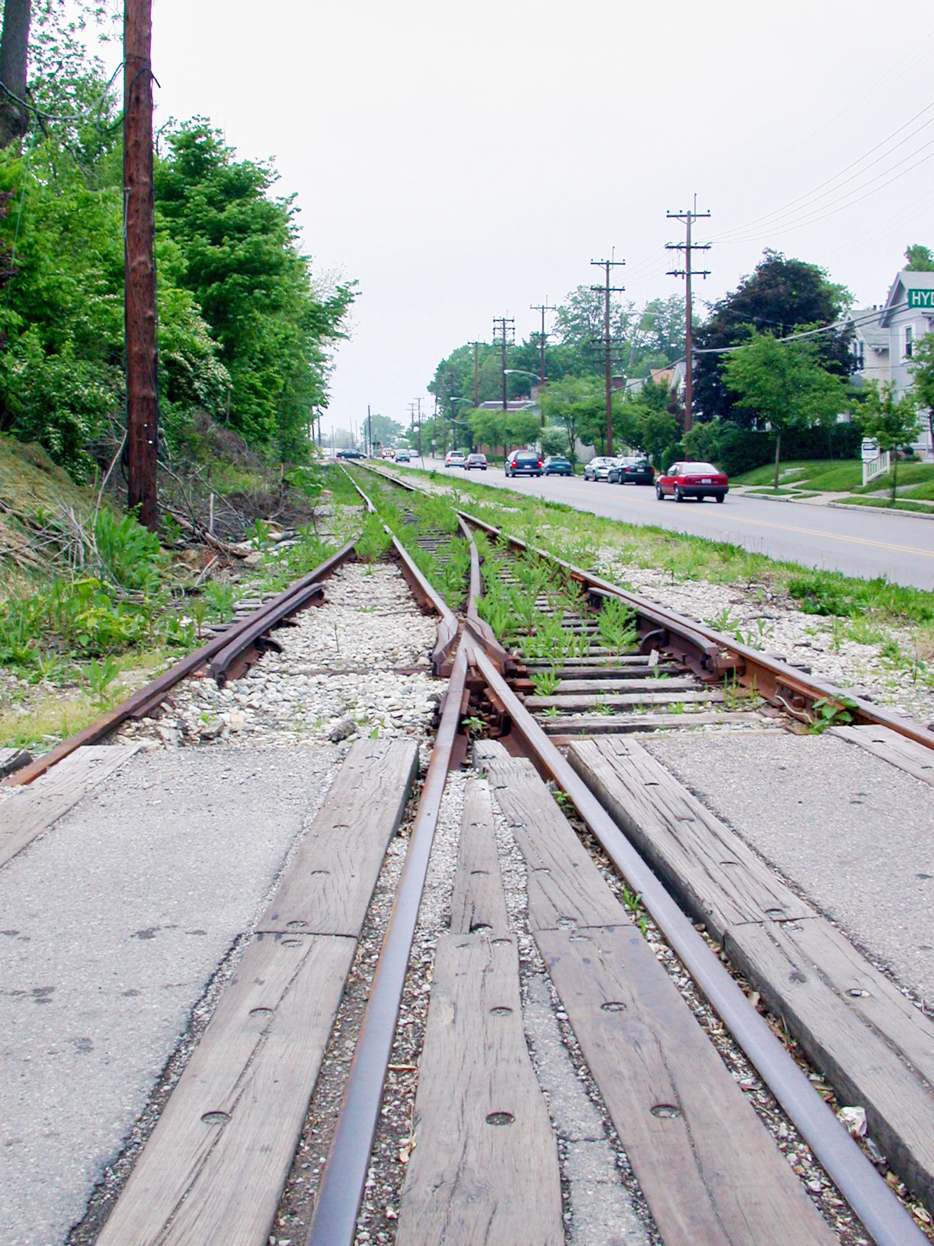N&W Hyde Park Branch route along Wasson Road in Hyde Park, looking west from Hyde Park Place. The spur curving off to the left is for a small industrial building behind. The track has been removed for the Wasson Way bike path.