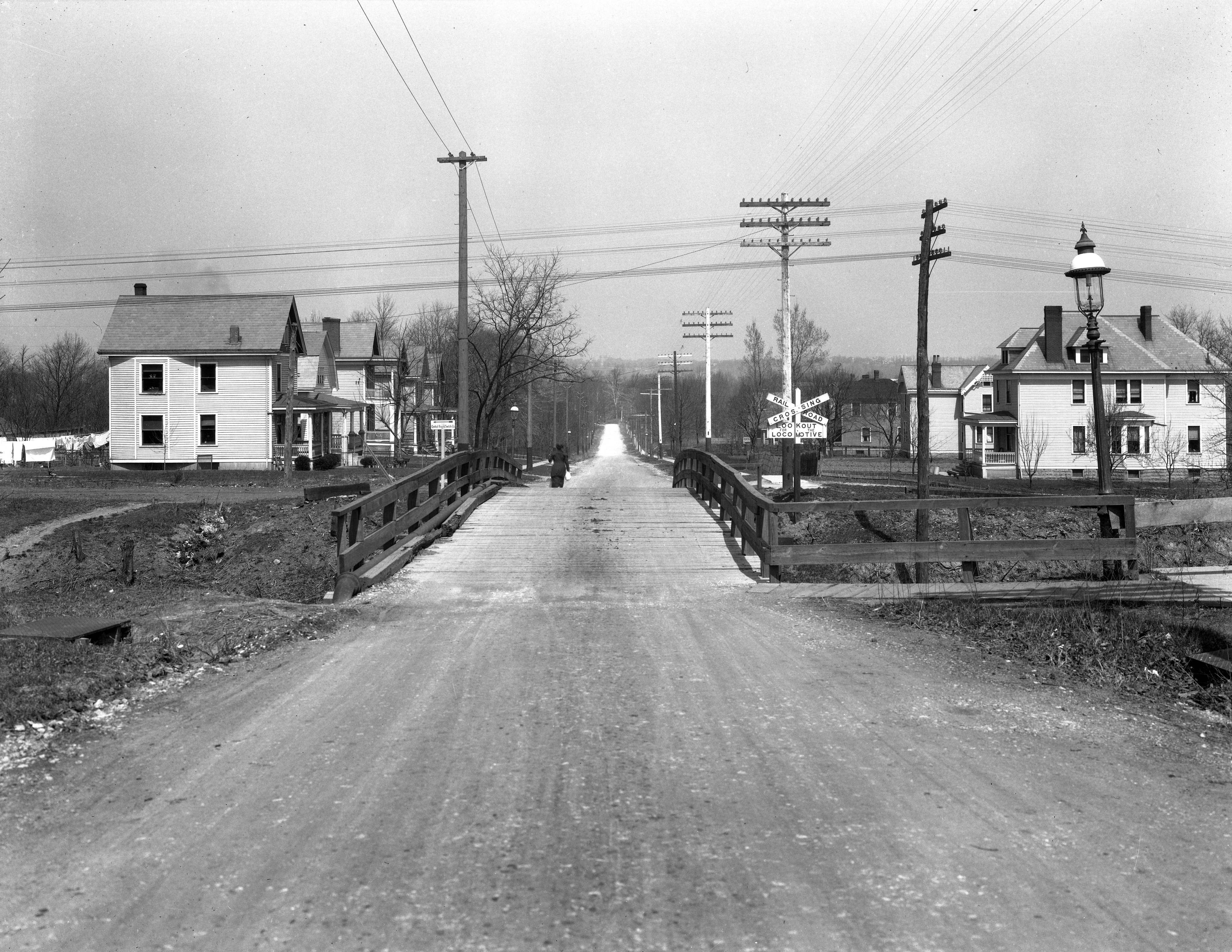 Historic photo of the Marburg Avenue overpass of the N&W Hyde Park Branch in East Hyde Park, looking north. A muddy Wasson Road can be seen at the left. From the University of Cincinnati Library Digital Resource Commons, Street Construction and Improvements collection.