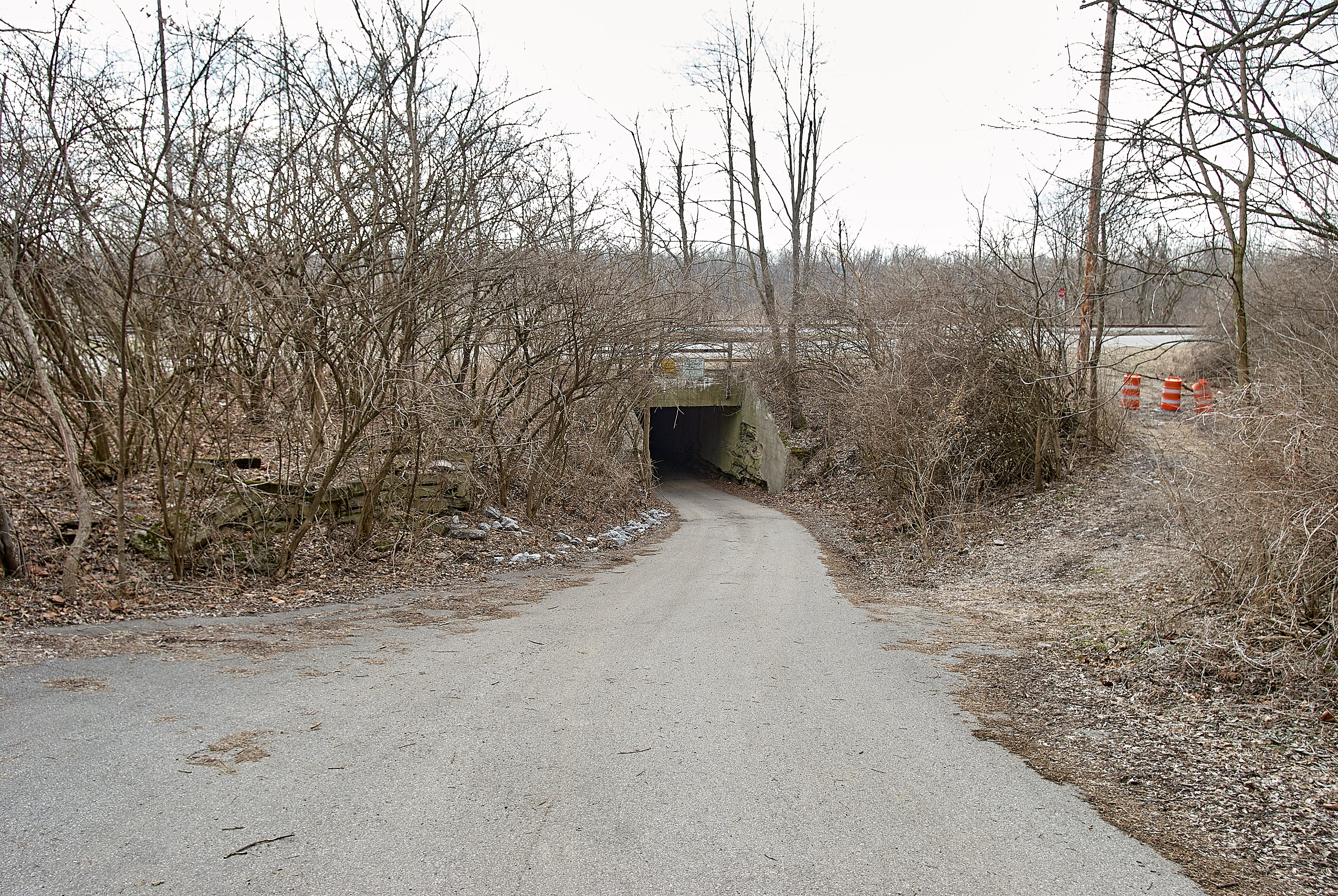 Tunnel under the N&W Hyde Park Branch line west of Clare Yard, looking south. The unnamed access road that goes through the tunnel shoots off from the end of Mariemont Avenue.