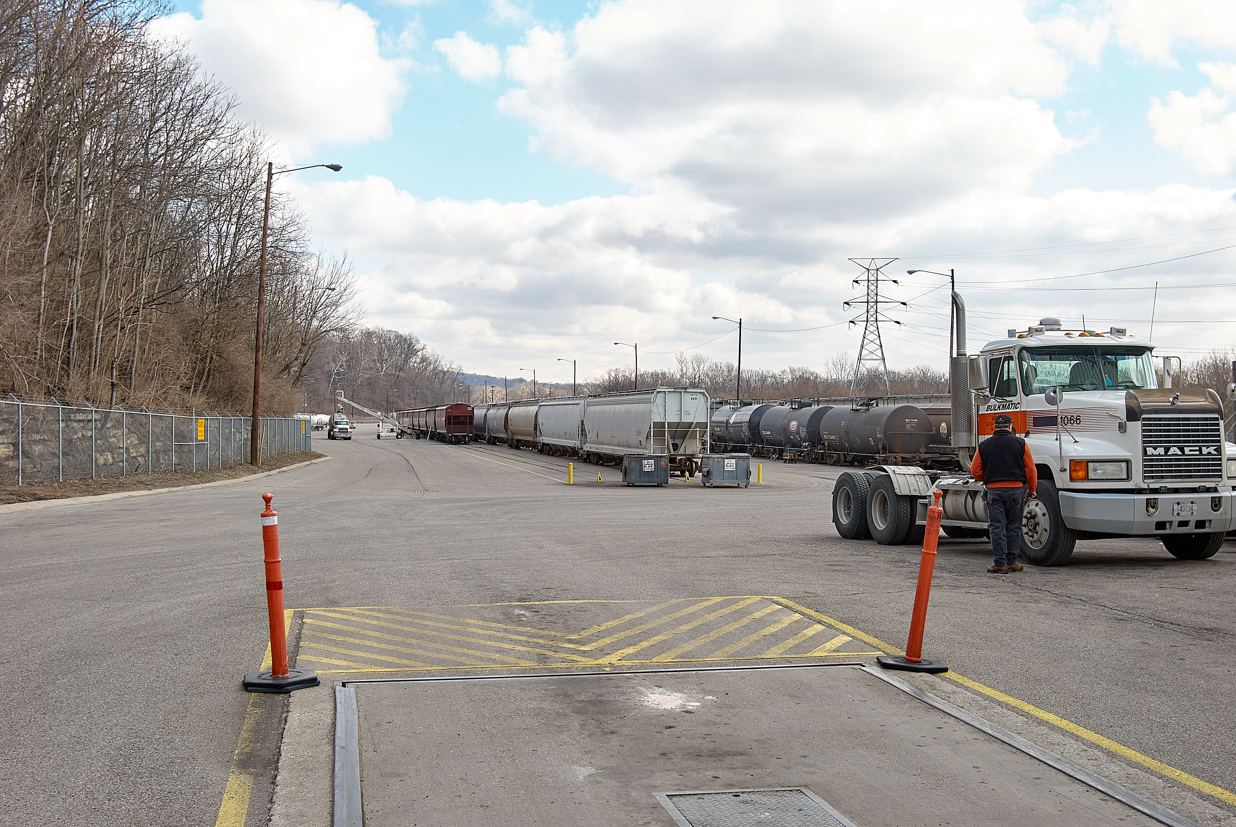 Looking east through Clare Yard. The concrete platform in the foreground is a scale for weighing empty and full trucks. It accurately weighed me standing on it to within 20 pounds. Note the old stone wall behind the fence at left.