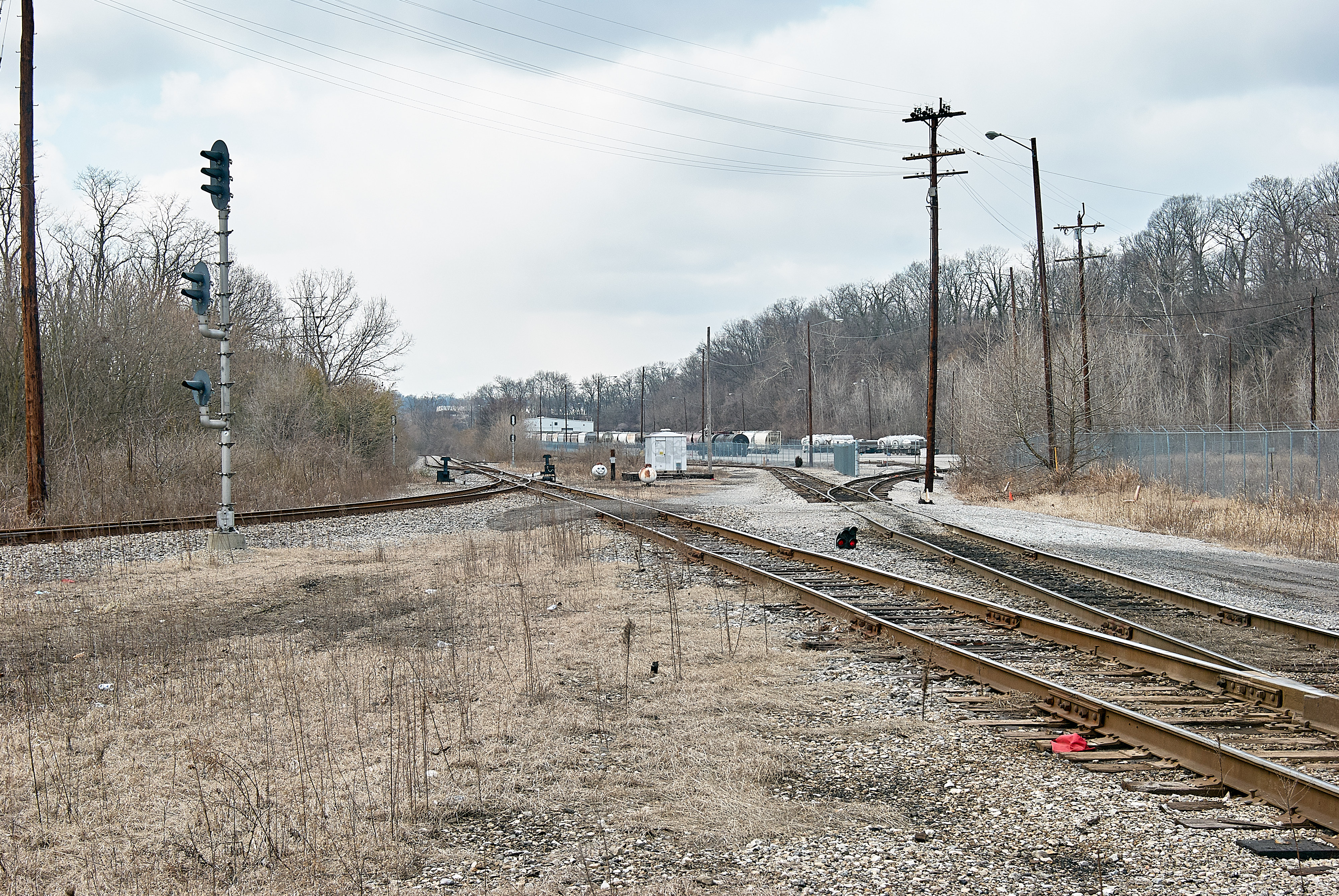 East side of Clare Yard, looking west. The former Pennsylvania/Little Miami Railroad runs from the center to the bottom right, and the approach to the bridge over the Little Miami River is curving to the left.