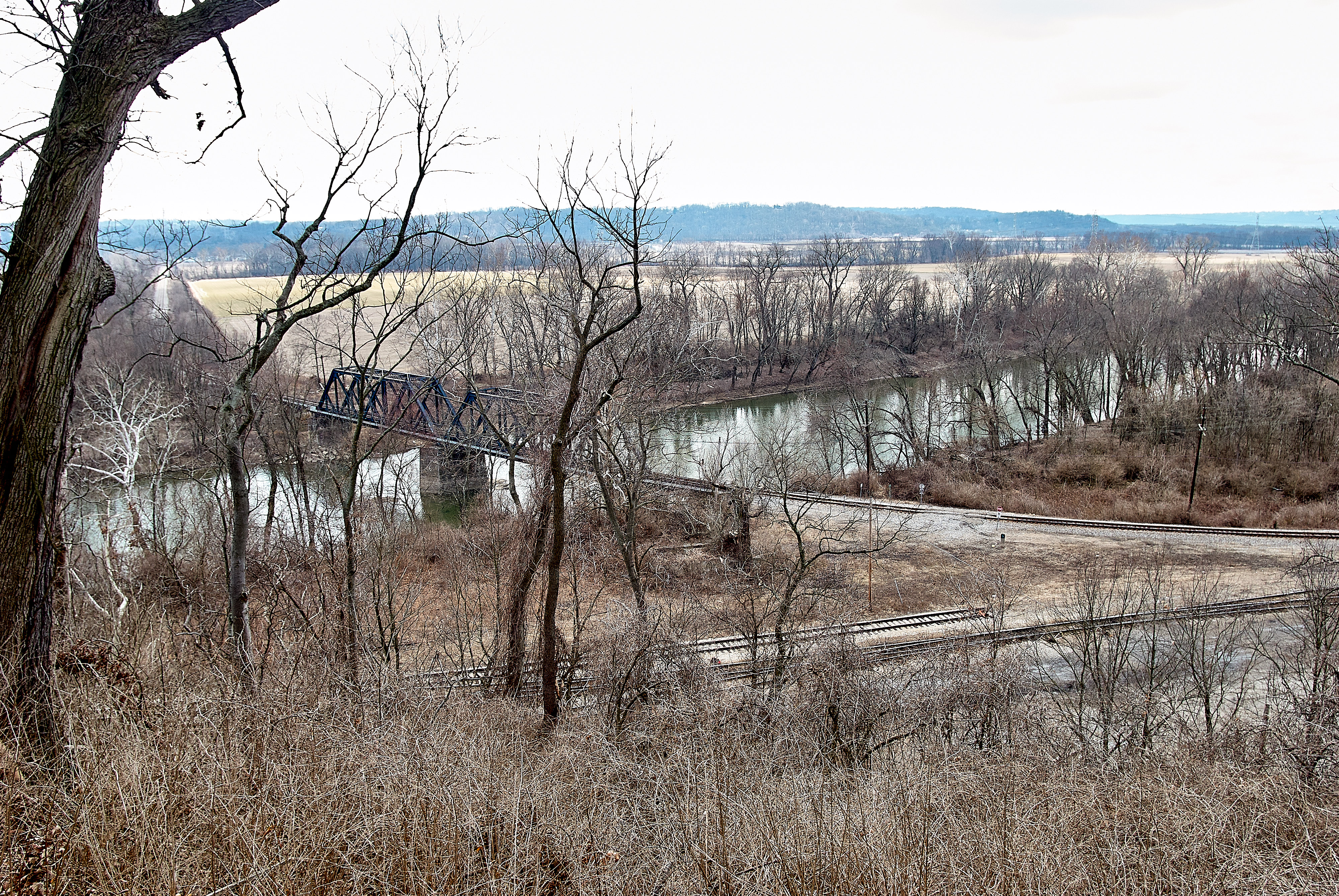 N&W Peavine line crossing the Little Miami River, looking south from the Mariemont Concourse. The tracks running from left to right are the former Pennsylvania/Little Miami Railroad, in this area now owned by Norfolk Southern and leased to Cincinnati Eastern Railroad for additional yards.