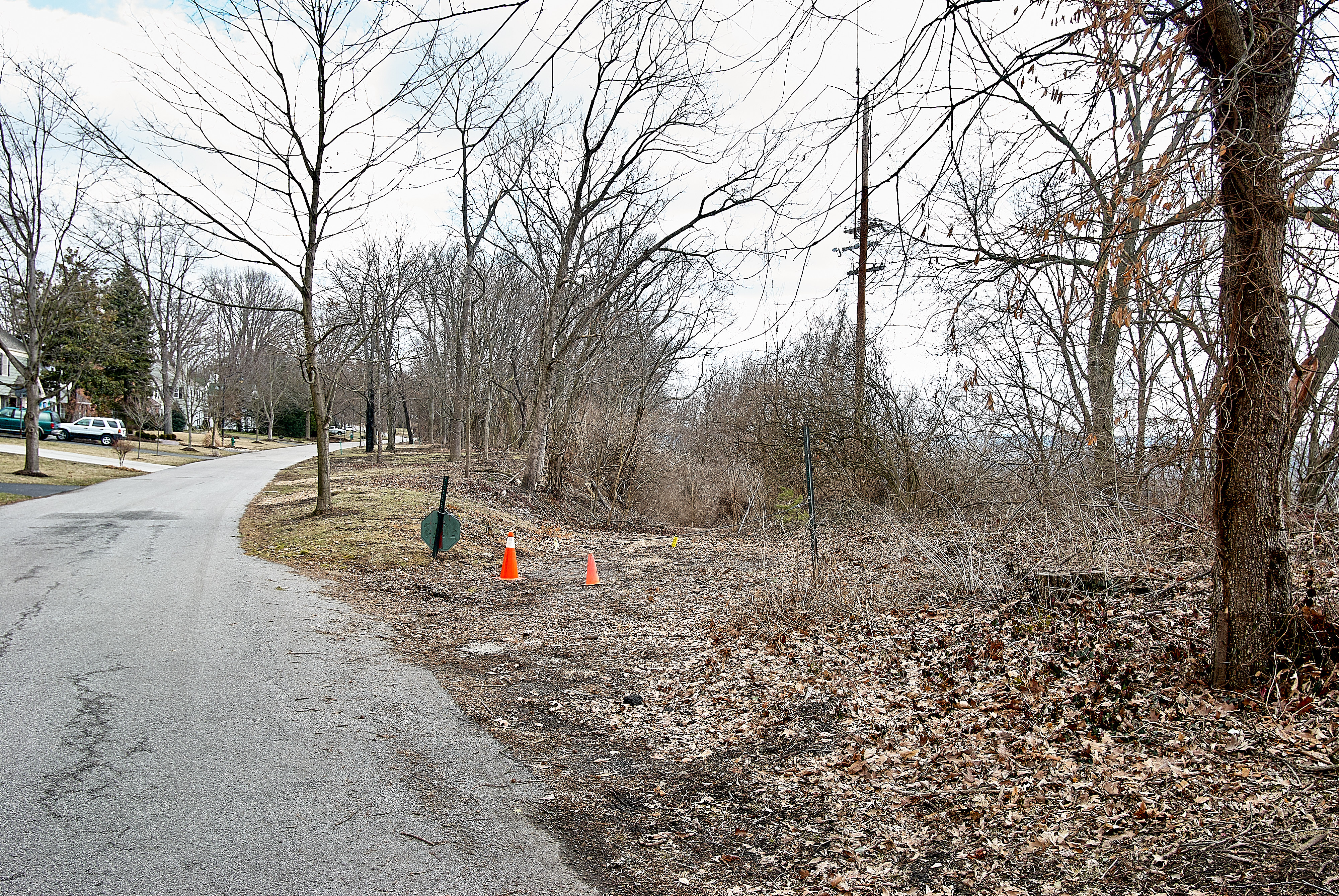 Old entrance road to Clare Yard, looking east along Miami Bluff Drive at the end of Cachepit Way. Some Maps still call this abandoned drive Clare Road, which predates Mariemont, and used to connect with Plainville Road at Wooster Pike.