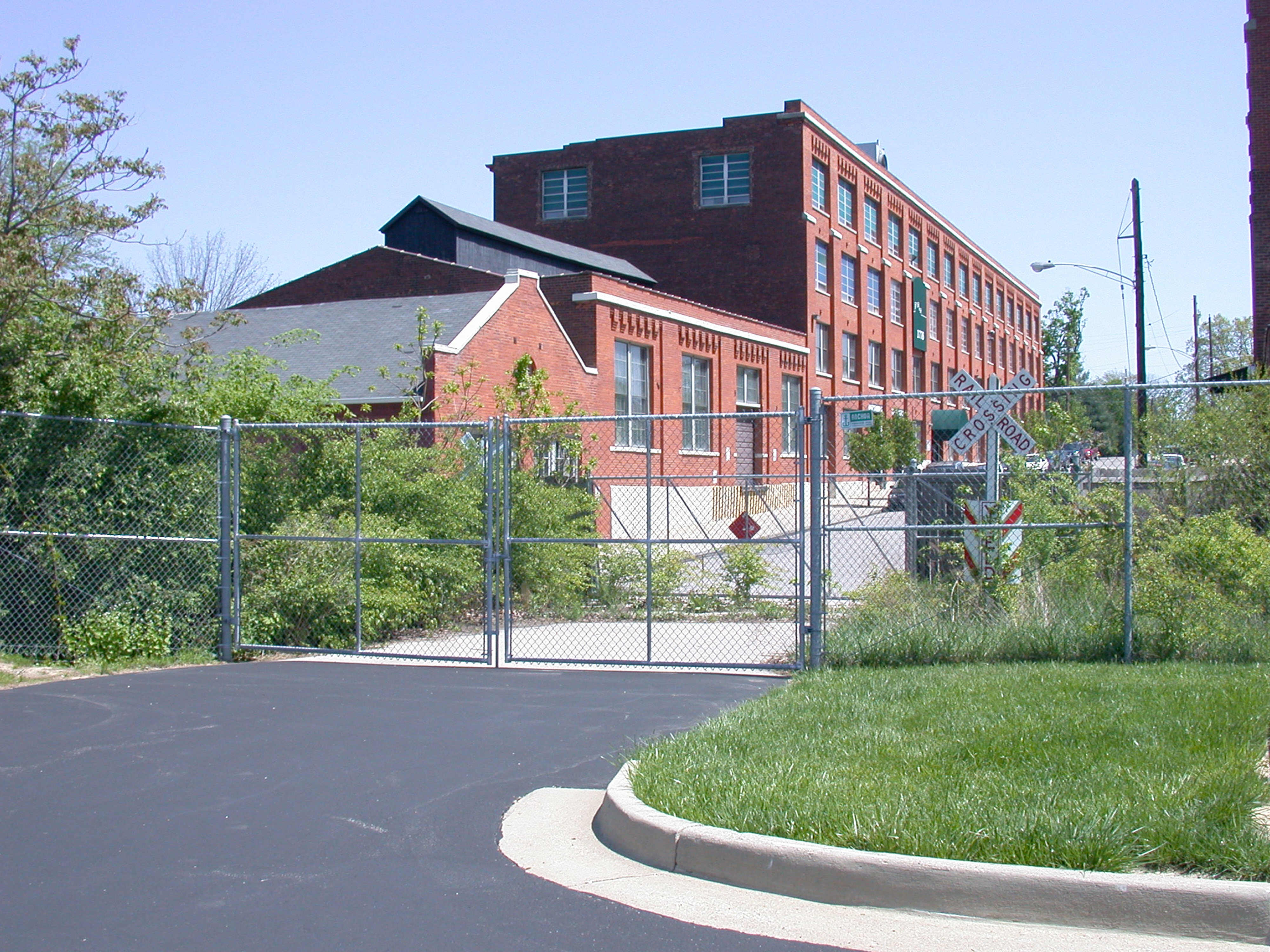 N&W line crossing Mentor Avenue in Norwood, looking east at the industrial building at the center of the previous aerial photo. The tracks to the right are now a multi-use path on Xavier University's campus, but it now ends here. This crossing is now passable for pedestrians and cyclists but not cars.