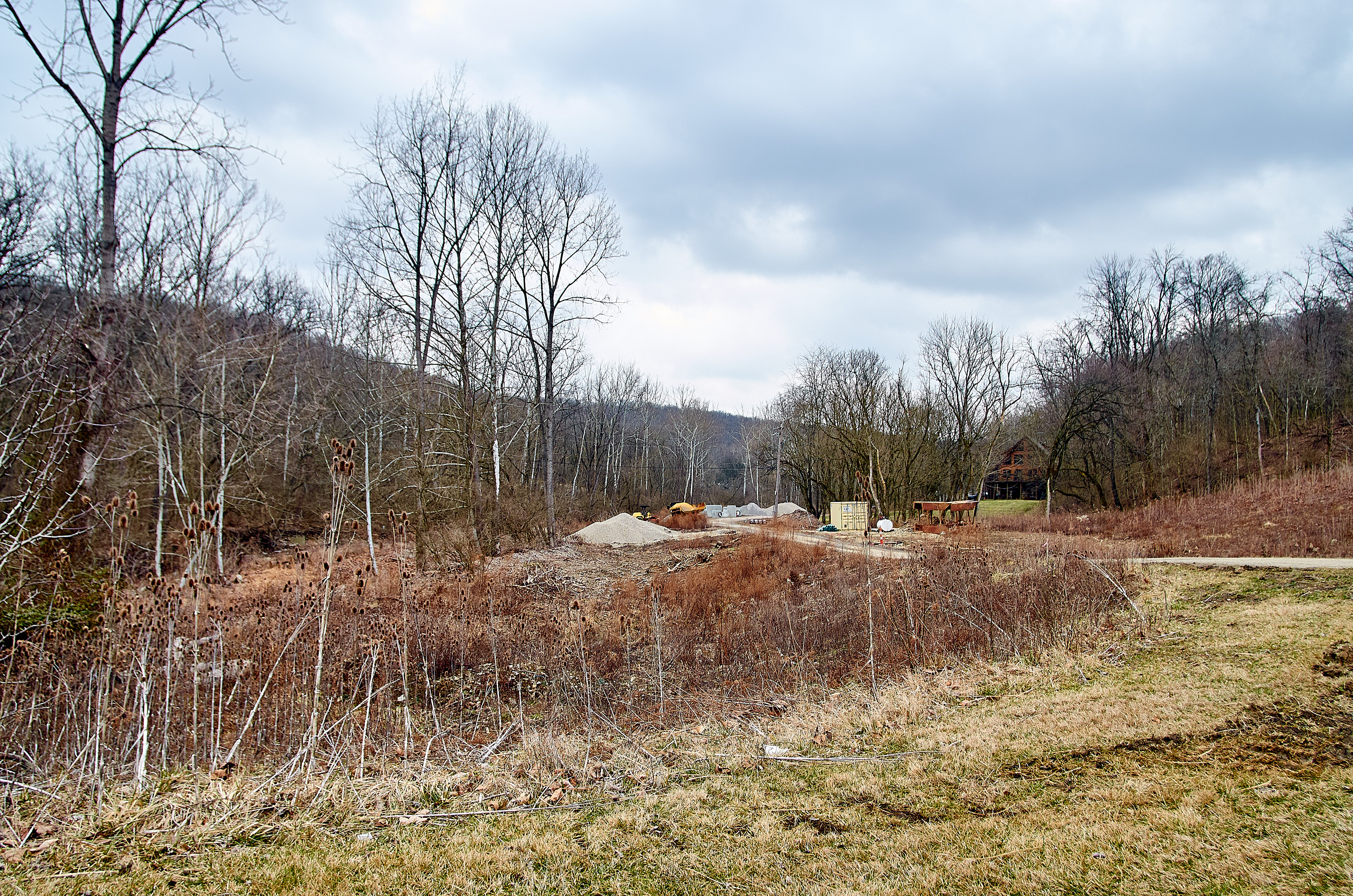 Cincinnati & Eastern New Richmond Branch route near Hickorycreek Drive in Anderson Township, looking east southeast from Hickorycreek. The road in the distance appears to be the rail bed, with newer grading on the right as it ramps up towards Hickorycreek.