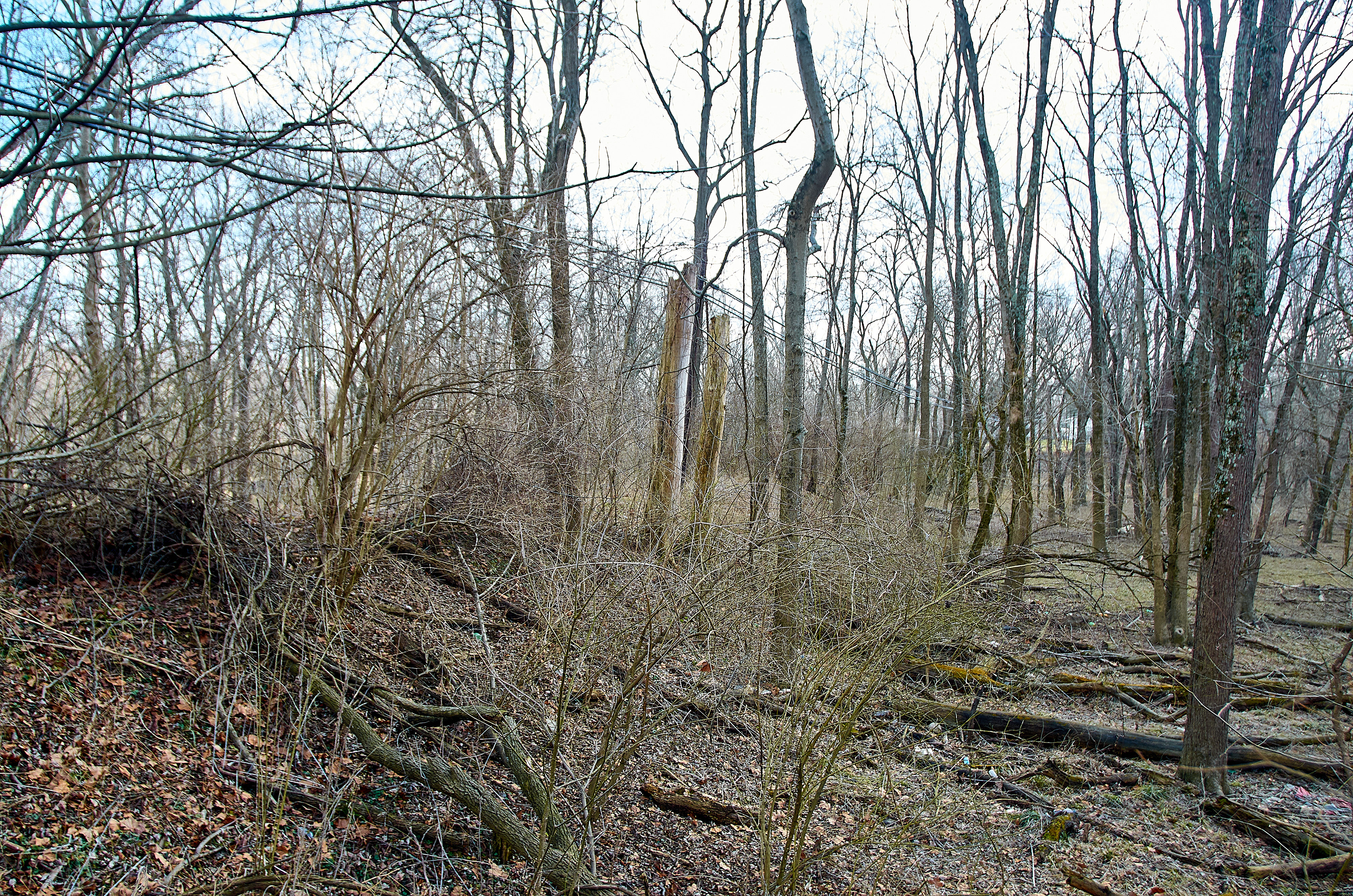 Cincinnati & Eastern New Richmond Branch route approaching Twelvemile Creek in New Richmond, looking south towards the creek. The utility poles and this mostly eroded berm mark what's left of the roadbed.