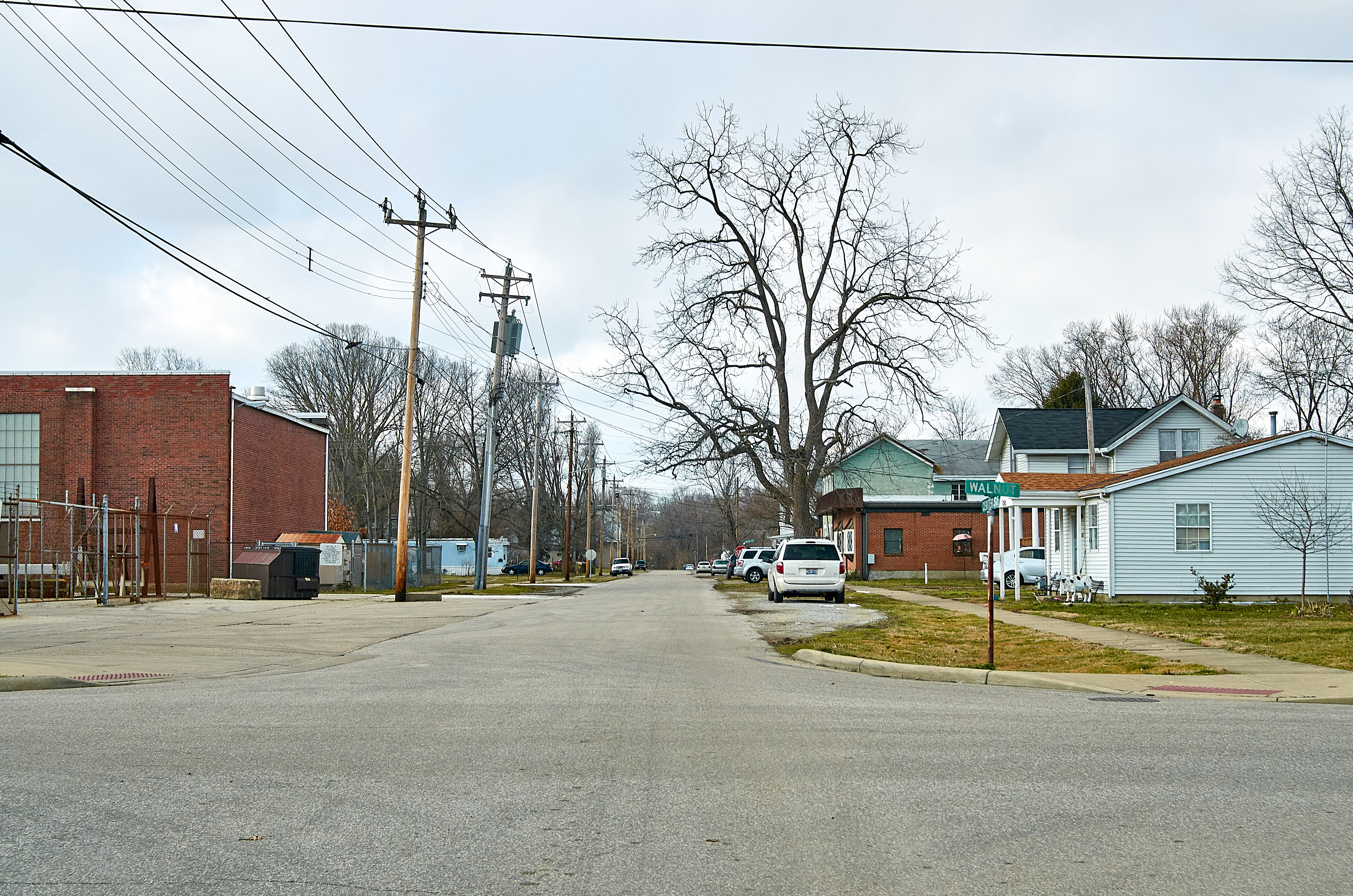 Cincinnati & Eastern New Richmond Branch route approaching Walnut Street along Center Street in New Richmond, looking north northwest across Walnut Street.