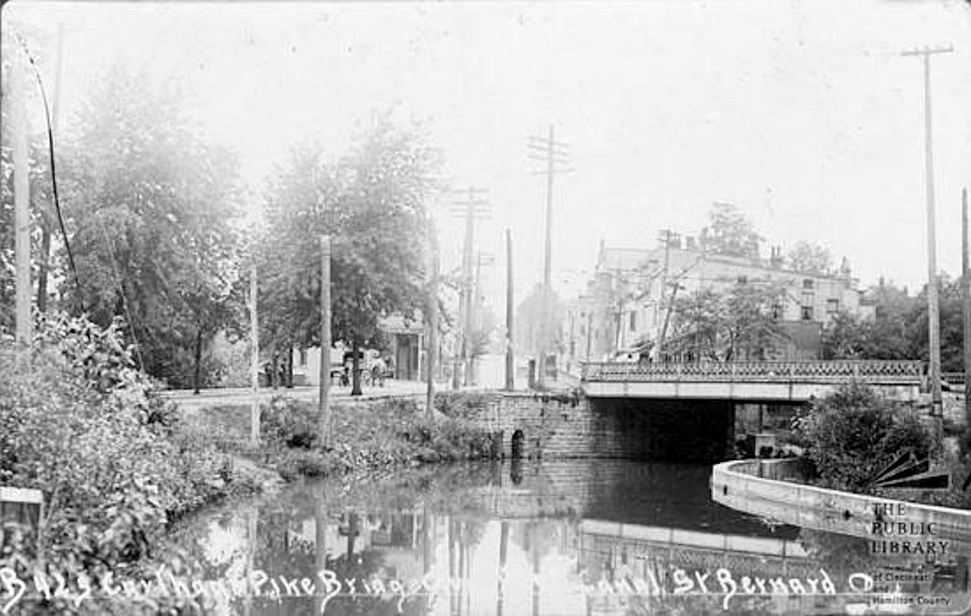 Historic photo of Vine Street in St. Bernard at Washington Avenue, looking south towards the vantage point of the last photo. Washington is the street on the left next to the canal embankment.