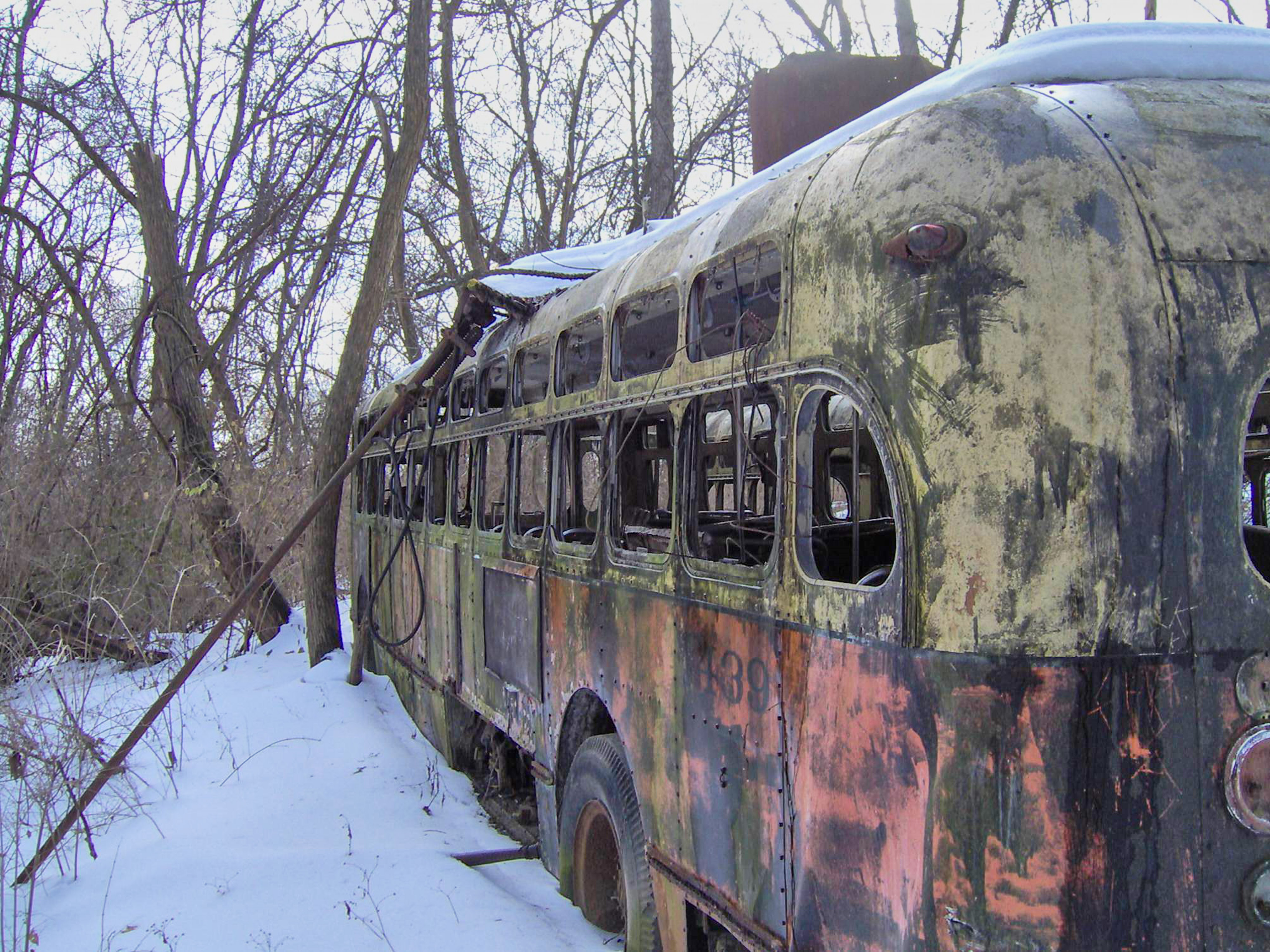 Abandoned trolleybusses in the woods behind Nick Sauber's parents house on Mullen Rd. at the edge of Colerain and Green Township. They have been here since sometime in the 1970s. They were built in 1949 by Marmon-Herrington Corp. of Indianapolis and were model TC48 (Trolley Coach, 48 passengers). They were equipped with GE electronics and were numbered in the 1400 series.