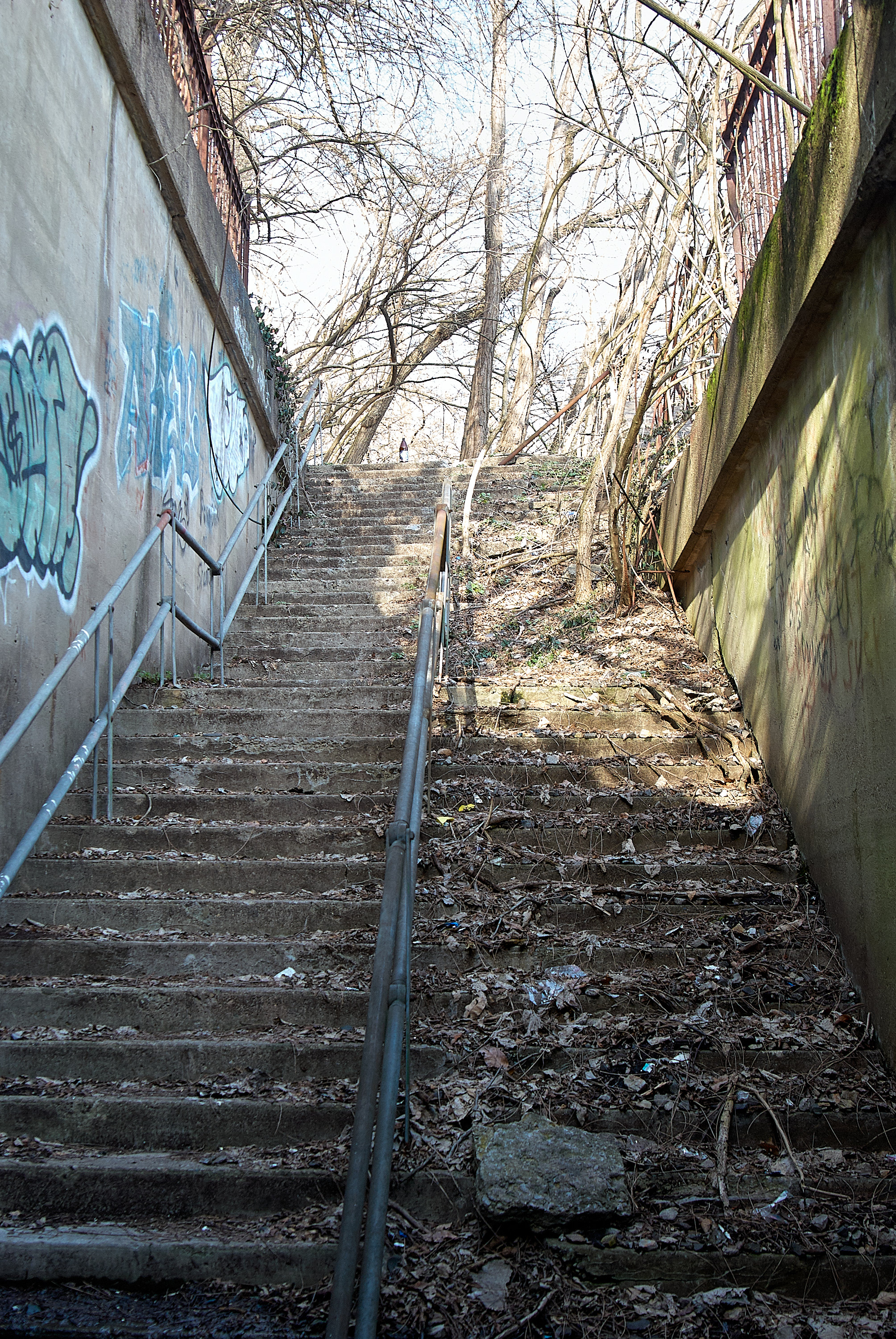 Stairs leading up from the abandoned pedestrian underpass of the Indiana & Ohio Oasis, former Pennsylvania/Little Miami Railroad in the East End, looking east. This is a pretty wide staircase and tunnel, though it doesn't lead anywhere anymore. This was probably for houses that used to line Columbia Avenue before it was widened into a parkway, so they could get to the East End streetcar line.