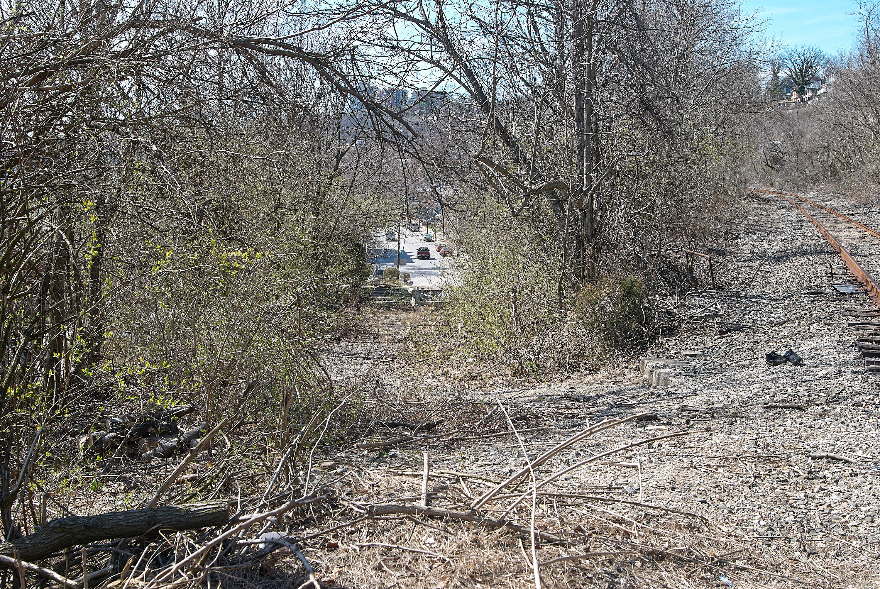 Torrence Road approaching the Indiana & Ohio Oasis, former Pennsylvania/Little Miami Railroad, looking west towards Riverside Drive. The houses above the railroad at the top right are on Taft Road near where it descends to Columbia Parkway. The station house with the stair tower is behind the bushes to the right of the road.
