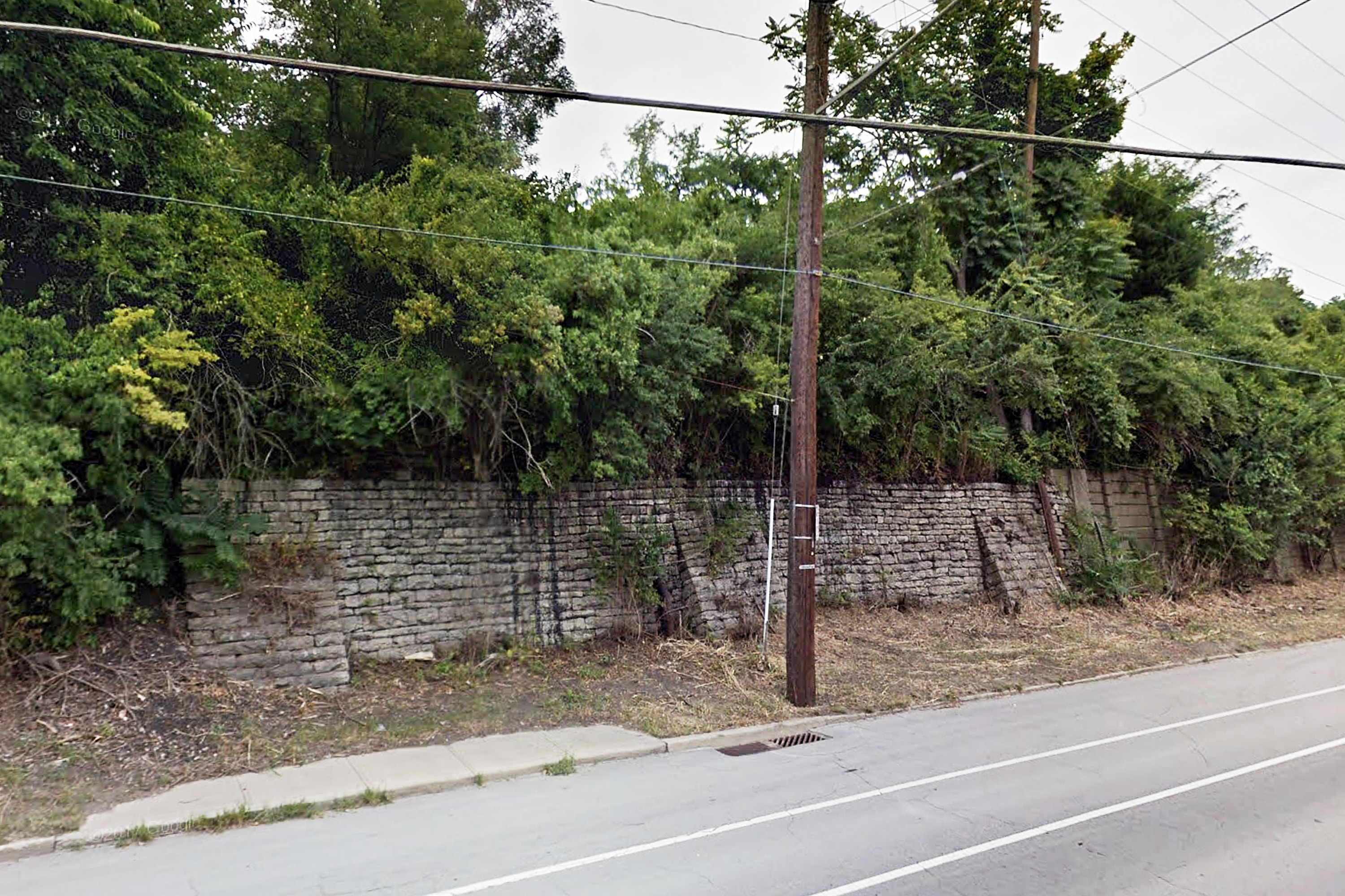Current view of Riverside Drive and the Pennsylvania/Little Miami Pendleton Yard area, looking east near the now unsigned and defunct Pittsburgh Street and the Duke Energy gas plant. The stone wall with the buttresses is the same one built at the inception of the Little Miami Railroad in the 1840s and seen in the previous woodcut. Photo from Google Street View