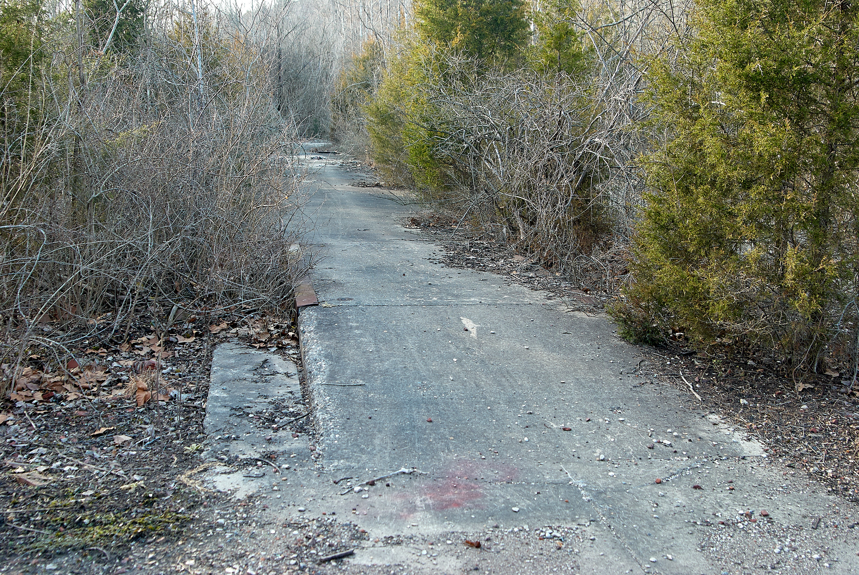 Pennsylvania/Little Miami Railroad shop ruins in the Pendleton Yard, looking northwest. The bushes and cedar trees are in pits where the tracks were, and this little rise here is for a small underpass for workers to get from one pit to another. This was removed to build the Walworth Junction housing development.
