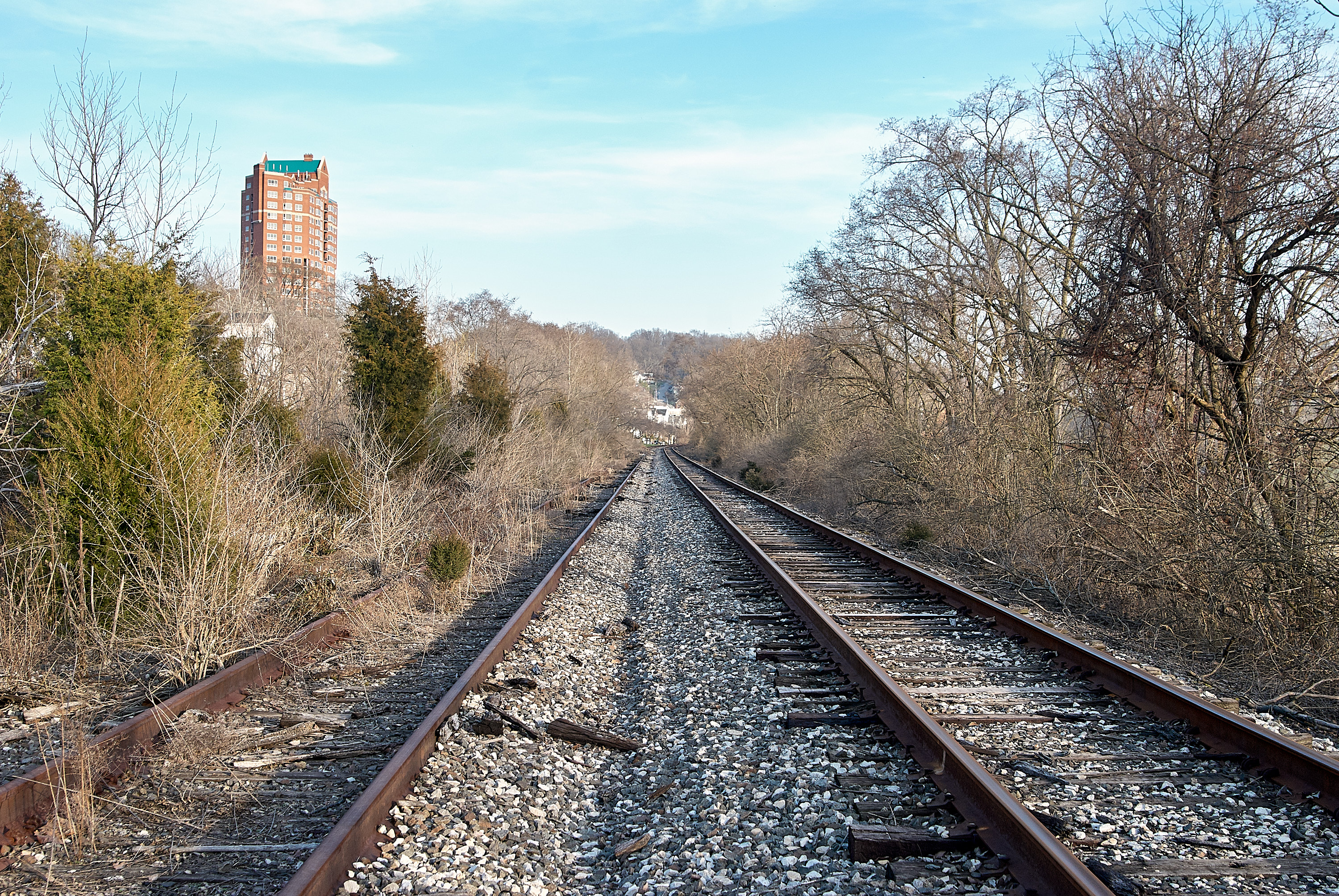 Indiana & Ohio Oasis, former Pennsylvania/Little Miami Railroad tracks next to the Pendleton Yard, looking southeast. The Walworth Junction Housing Development now occupies all the land to the left.