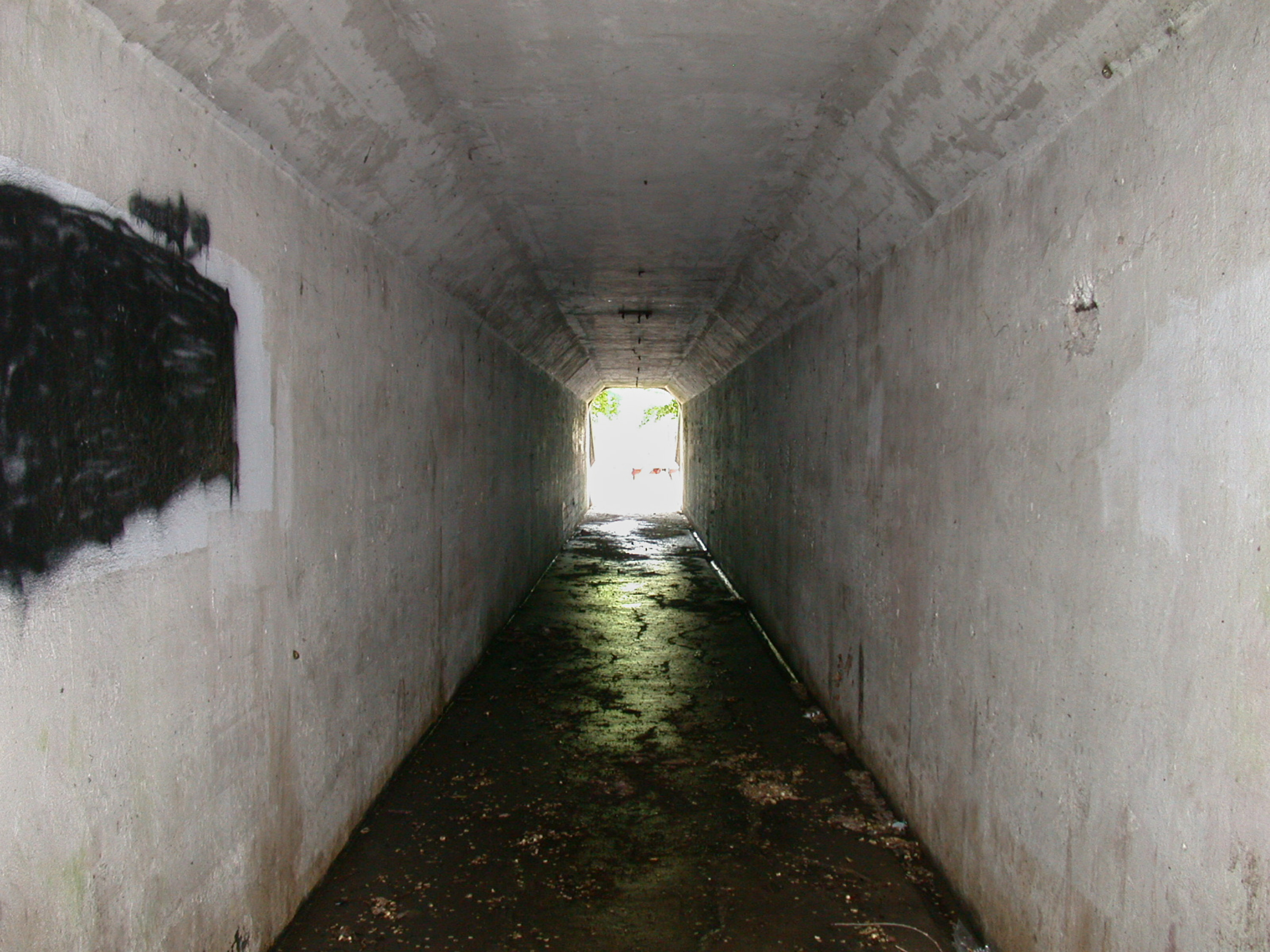 Indiana & Ohio Oasis, former Pennsylvania/Little Miami Railroad pedestrian underpass along Walworth Avenue in Columbia-Tusculum, looking south. Eastern Avenue/Riverside Drive is on the other side of the tunnel.