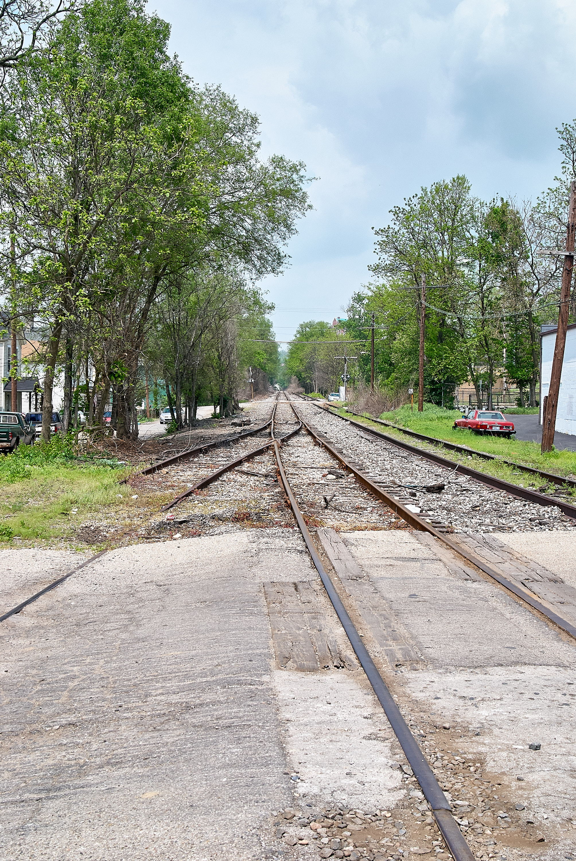 Connection of the Cincinnati, Georgetown & Portsmouth and the Indiana & Ohio Oasis, former Pennsylvania/Little Miami Railroad at McCullough Street in Columbia-Tusculum, looking northwest. The two track mainline is curving slightly to the right-bottom of the photo, although the rightmost track is now abandoned. The spur coming off to the left was once the CG&P, as seen in the previous photos.