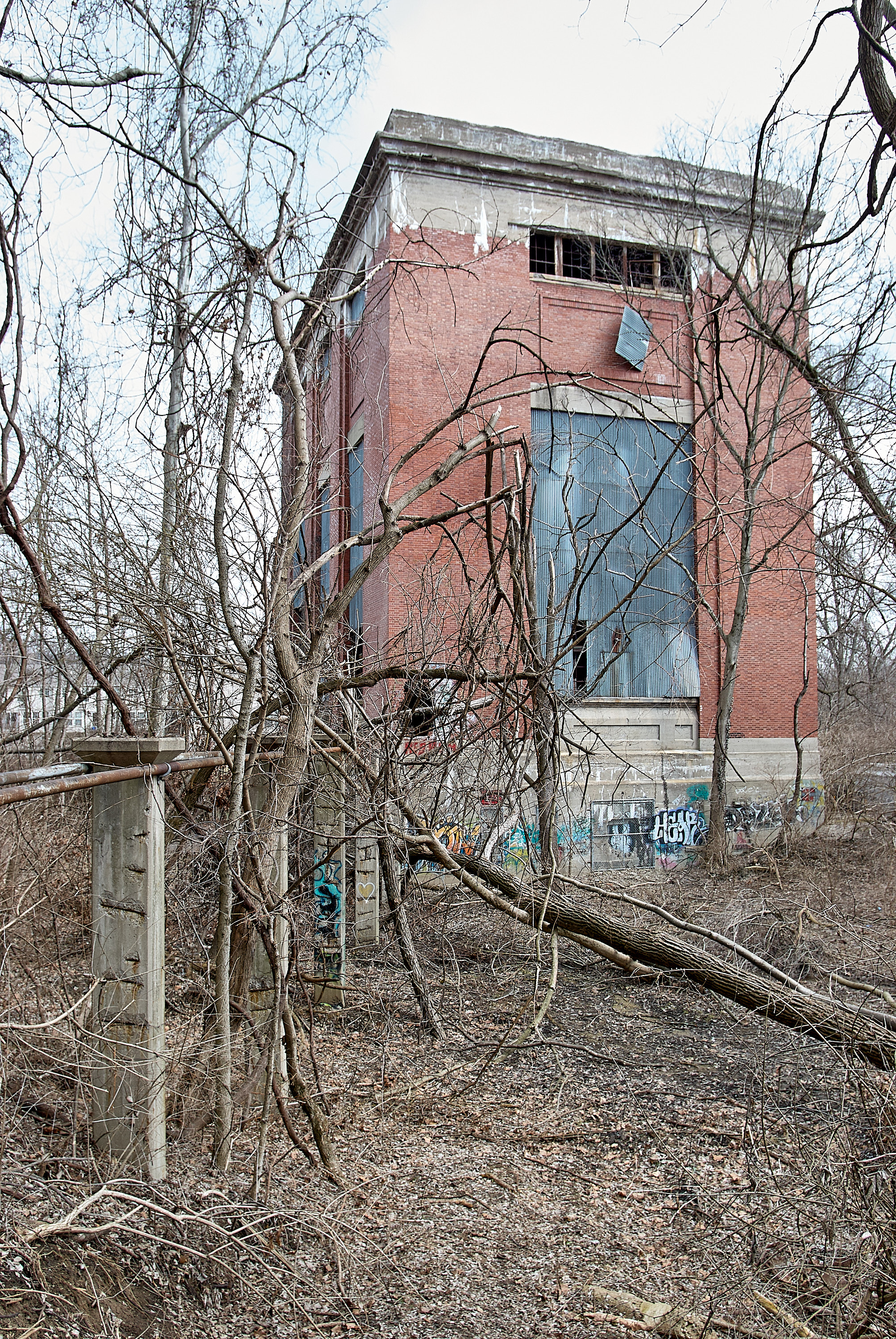 Mariemont's old steam heating plant along the former PRR/Little Miami, looking east along the old steam line. There are two small pipes running along these concrete columns, but the steam pipe itself has been removed. This system did not return condensate back to the plant, it was simply drained away at the point of use and fresh water was brought in from the river to make new steam. Thus, I'm not sure what the smaller pipes were for.