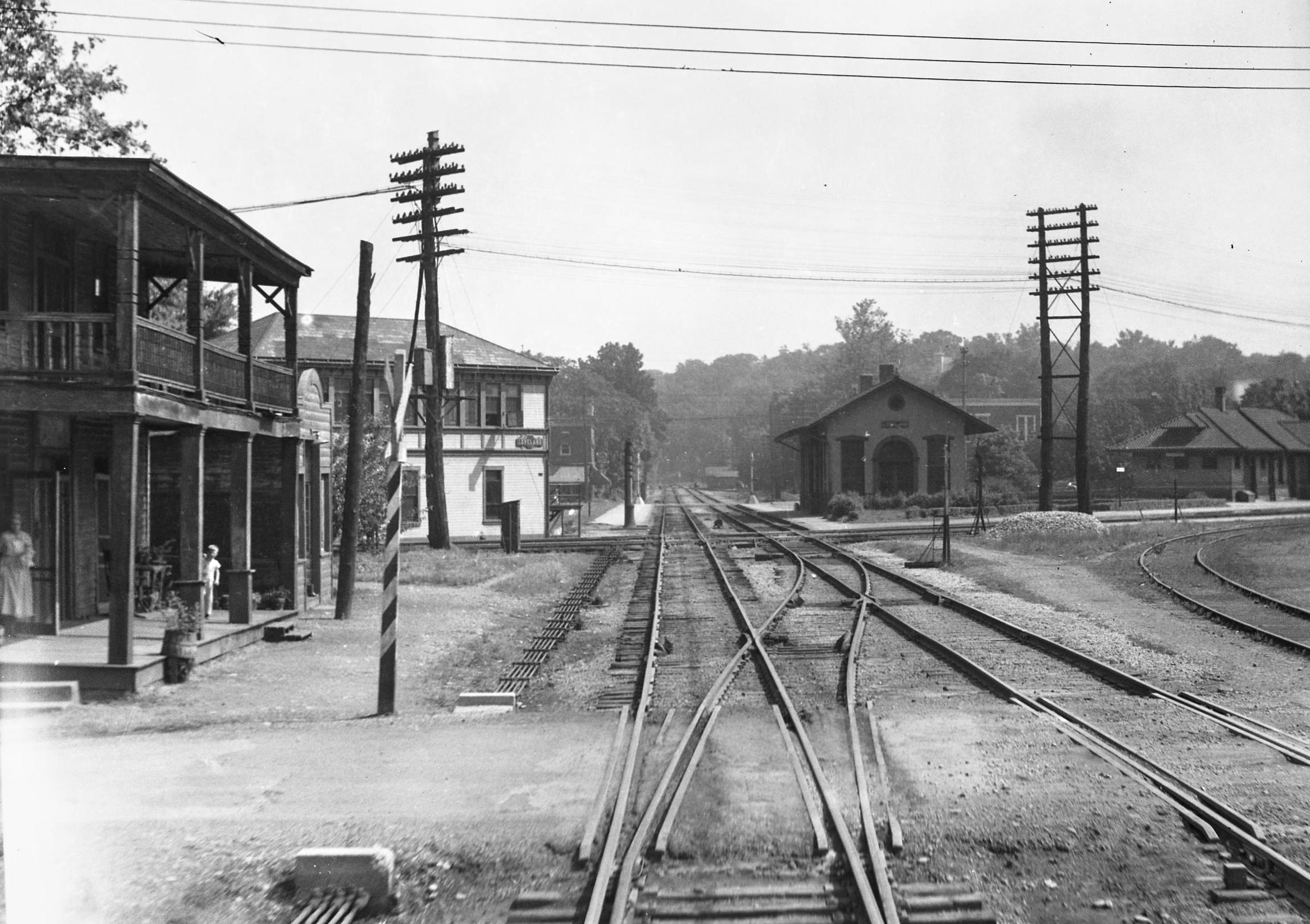 Historic photo of the Pennsylvania/Little Miami Railroad approaching the center of Loveland, looking north northeast across Broadway Street. The Marietta/B&O Midland Railroad station is at the far right, the Pennsylvania station is to its left with the gable roof, and the sizable B&O switching tower is to the left of the tracks.