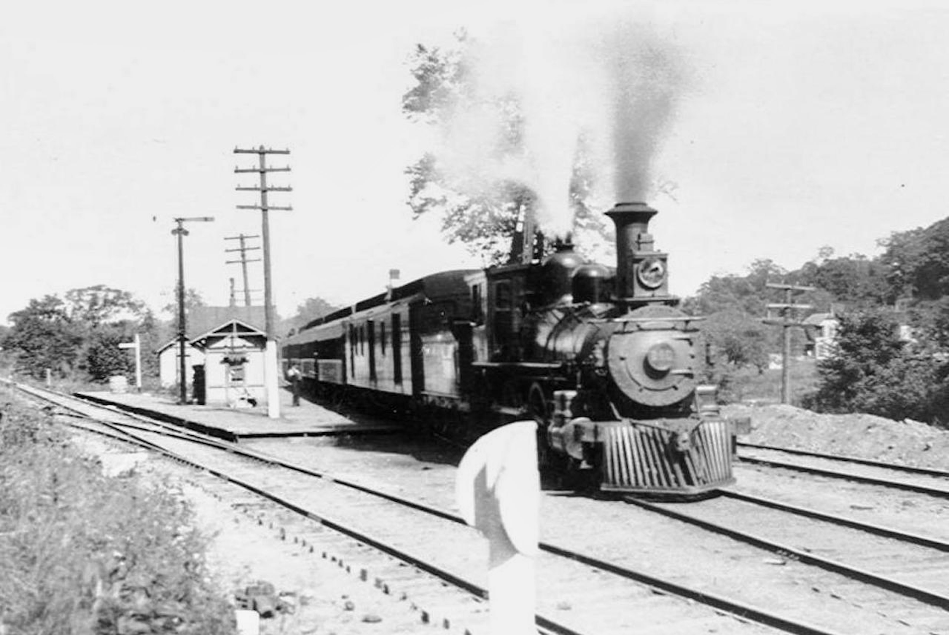 Historic photo of Rendcomb Junction on the Pennsylvania/Little Miami Railroad, looking northeast from the vantage point of the previous photo. The train is on the PRR/Little Miami mainline, and the track to the left is the start of the Richmond Division.