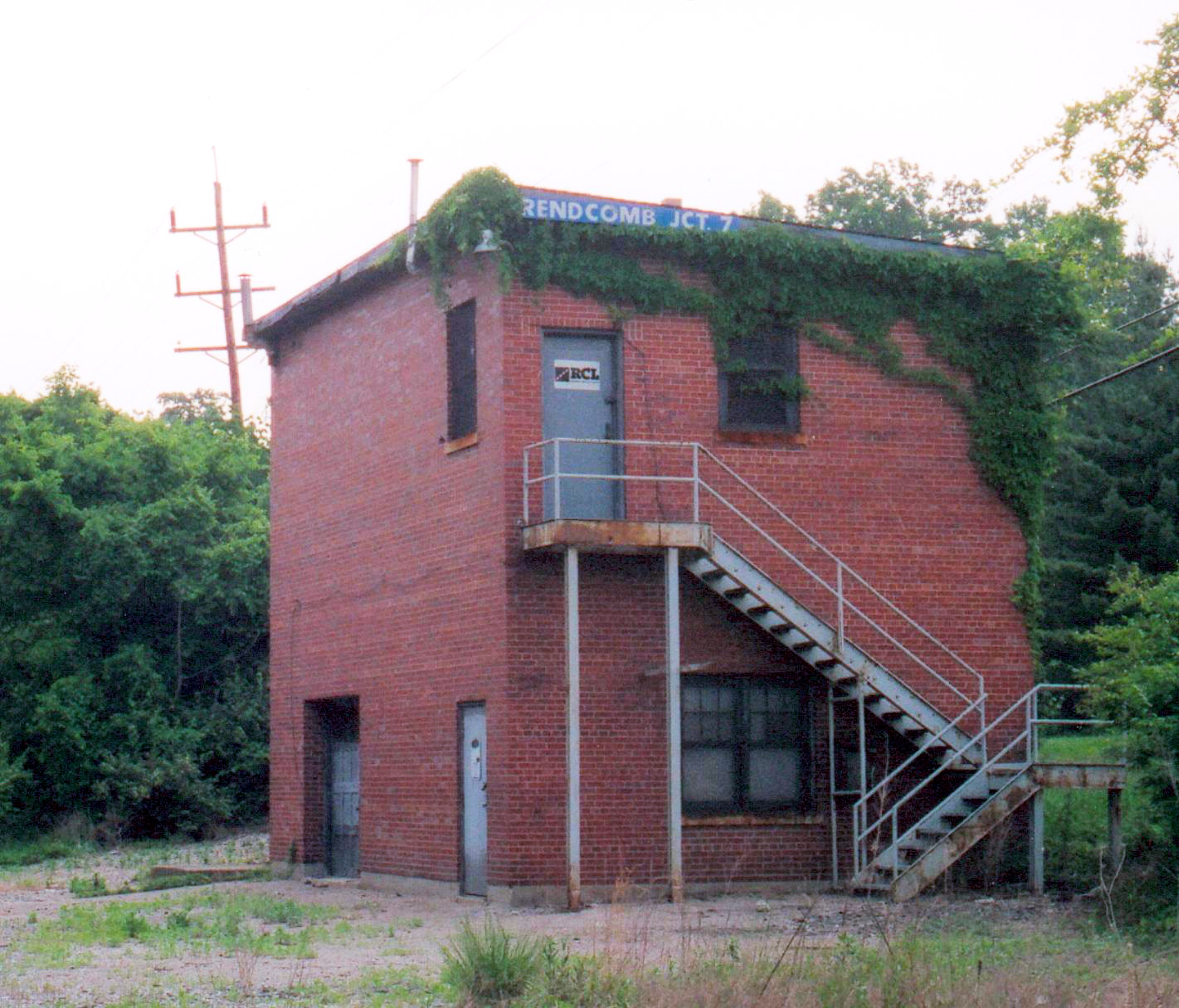 Rendcomb Junction tower in Linwood, looking southwest in May, 2004. There was once a wooden interlocking tower where the brick structure is now, a wood shed at the left of the photo, and a commuter station behind the photographer to the right. Rendcomb once controlled the eastern end of Undercliff Yard and the junction of the PRR's Richmond and Cincinnati Divisions. Currently the I&O has a single track running past the tower from Undercliff to Valley out of photo to the left. The tower can be seen at the end of Eastern Avenue just before the onramp to Columbia Parkway. Photo by Mike Oestreich.
