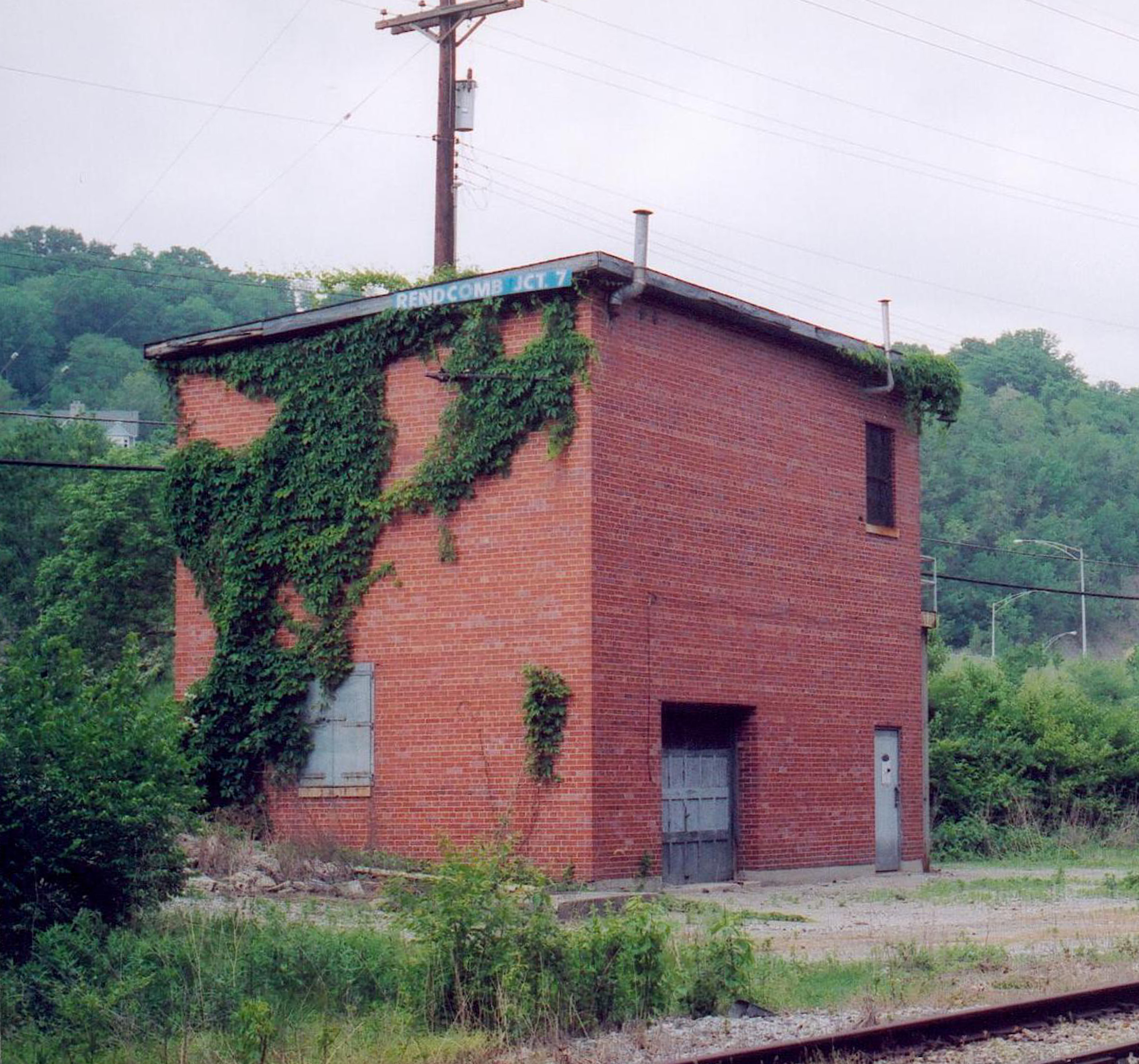 Tower at Rendcomb Jct. in Linwood looking northeast in May, 2004. Street lights of Columbia Parkway can be seen at center right. There are no switches near the building anymore and it looks unused, but there are still rails set in the concrete under the garage door, likely for a speeder or other piece of equipment. There was at least one other track closer to the building at some point which would have been where the Richmond Division split off and headed to Oakley (now accomplished at Valley) and the commuter station was to the right. Tracks in the foreground once headed directly to Red Bank and Clare but now go to Valley. Photo by Mike Oestreich.