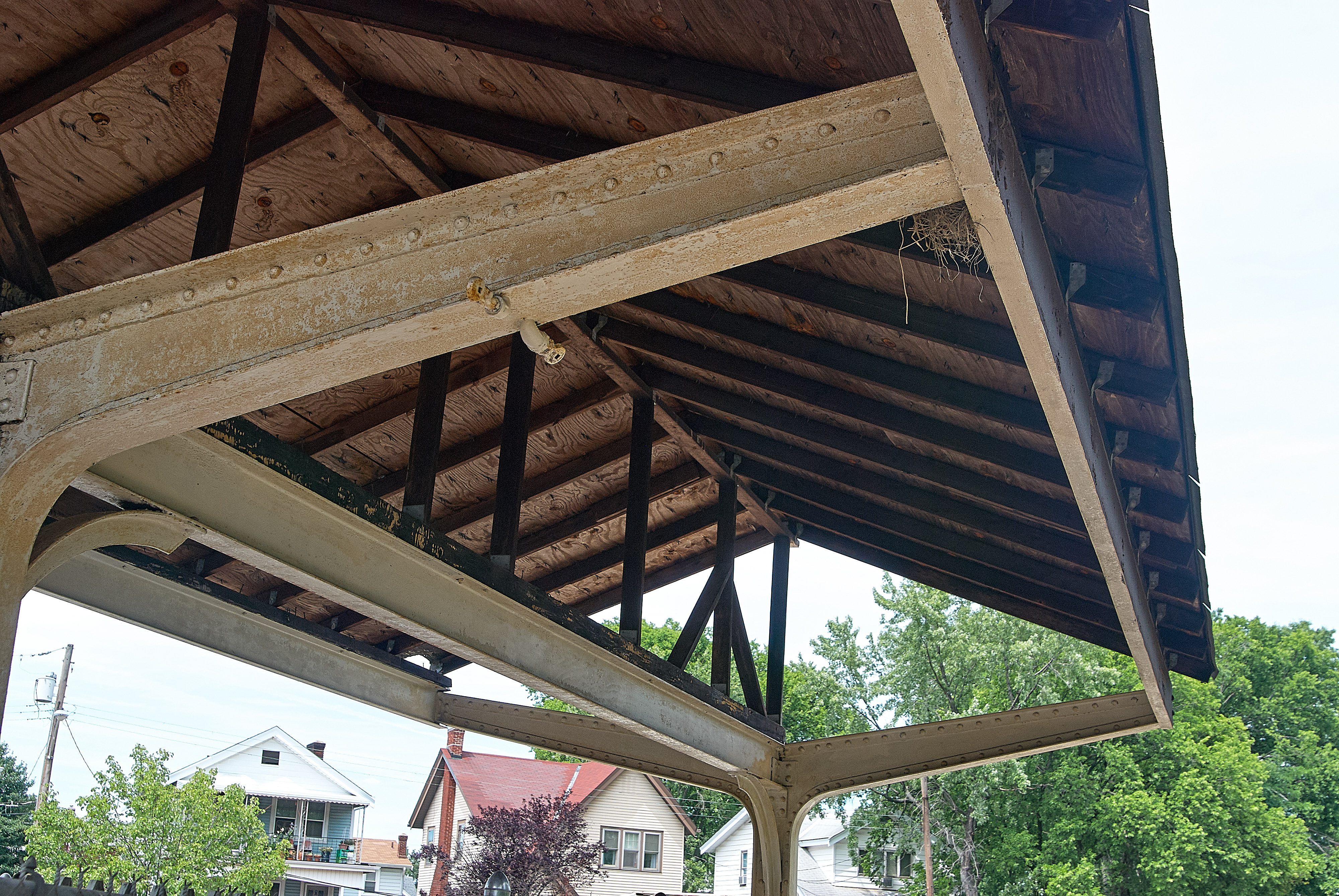 Canopy detail on the Norwood station, looking north at the north platform. The houses in the distance are on Harris Place.