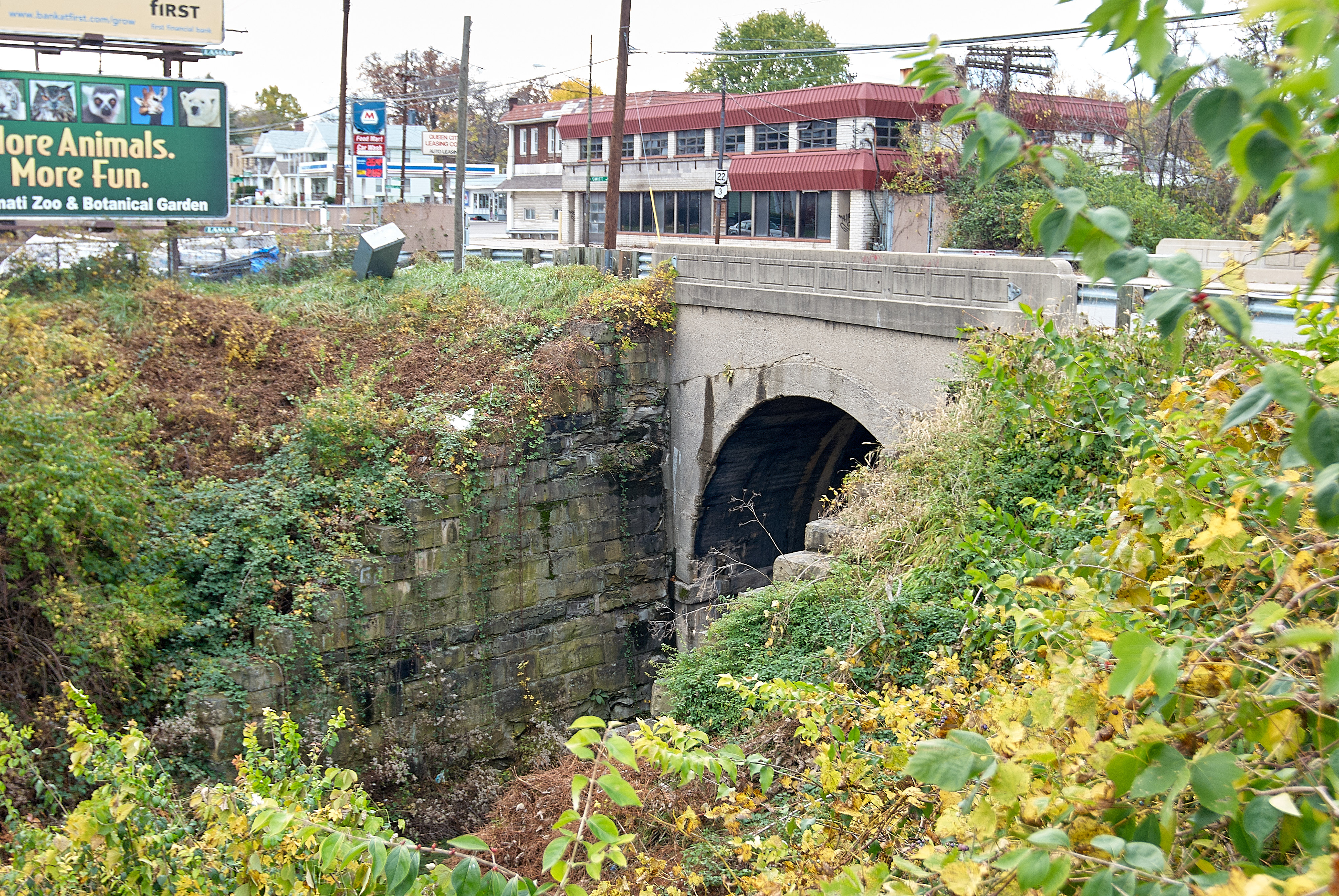 PRR Richmond Division underpass at Montgomery Road in Pleasant Ridge, looking west. The stone abutments probably date from the original construction of the line, while the concrete arch is from 1930. The concrete railings were rebuilt rather recently.