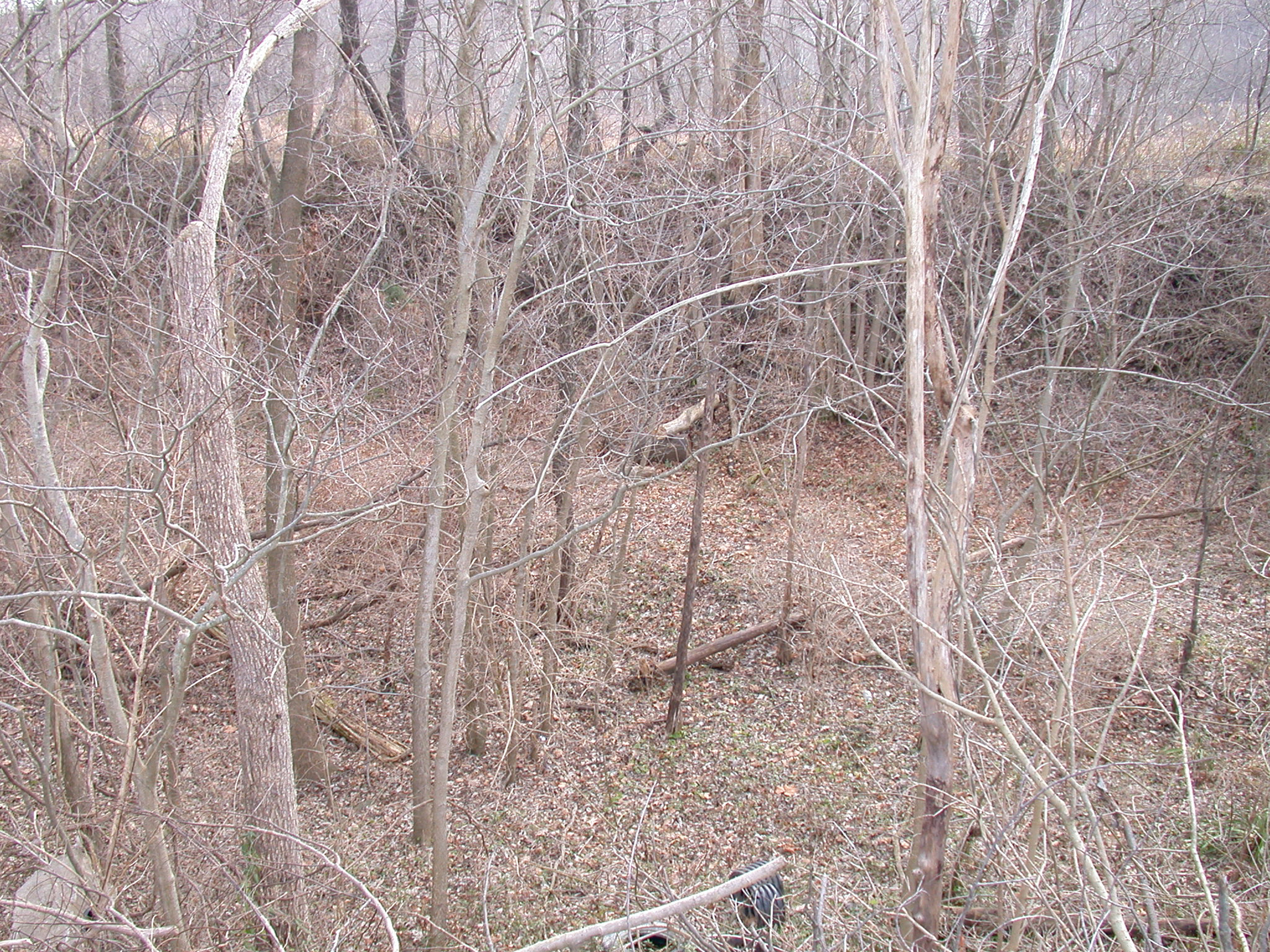 Cincinnati & Muskingum Valley (PRR Zanesville Branch) ROW looking south from inside the cemetery at the end of 2nd Street in Morrow. Note the tamped down area of the route at the bottom of this trench.