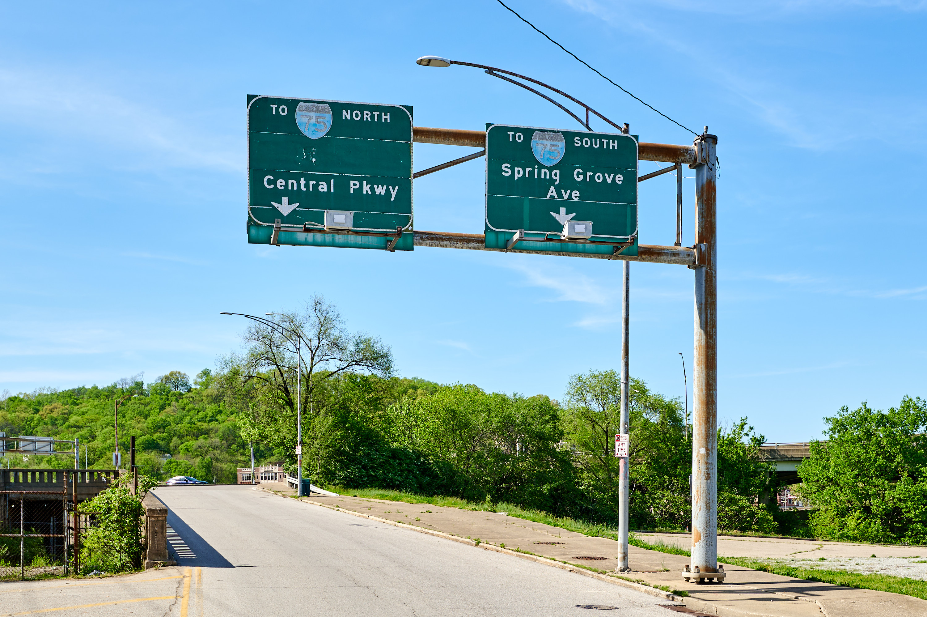 Some very old button copy overhead road signs at the abandoned Western Hills Viaduct streetcar ramp from the lower deck to State Avenue, looking north towards Harrison Avenue.