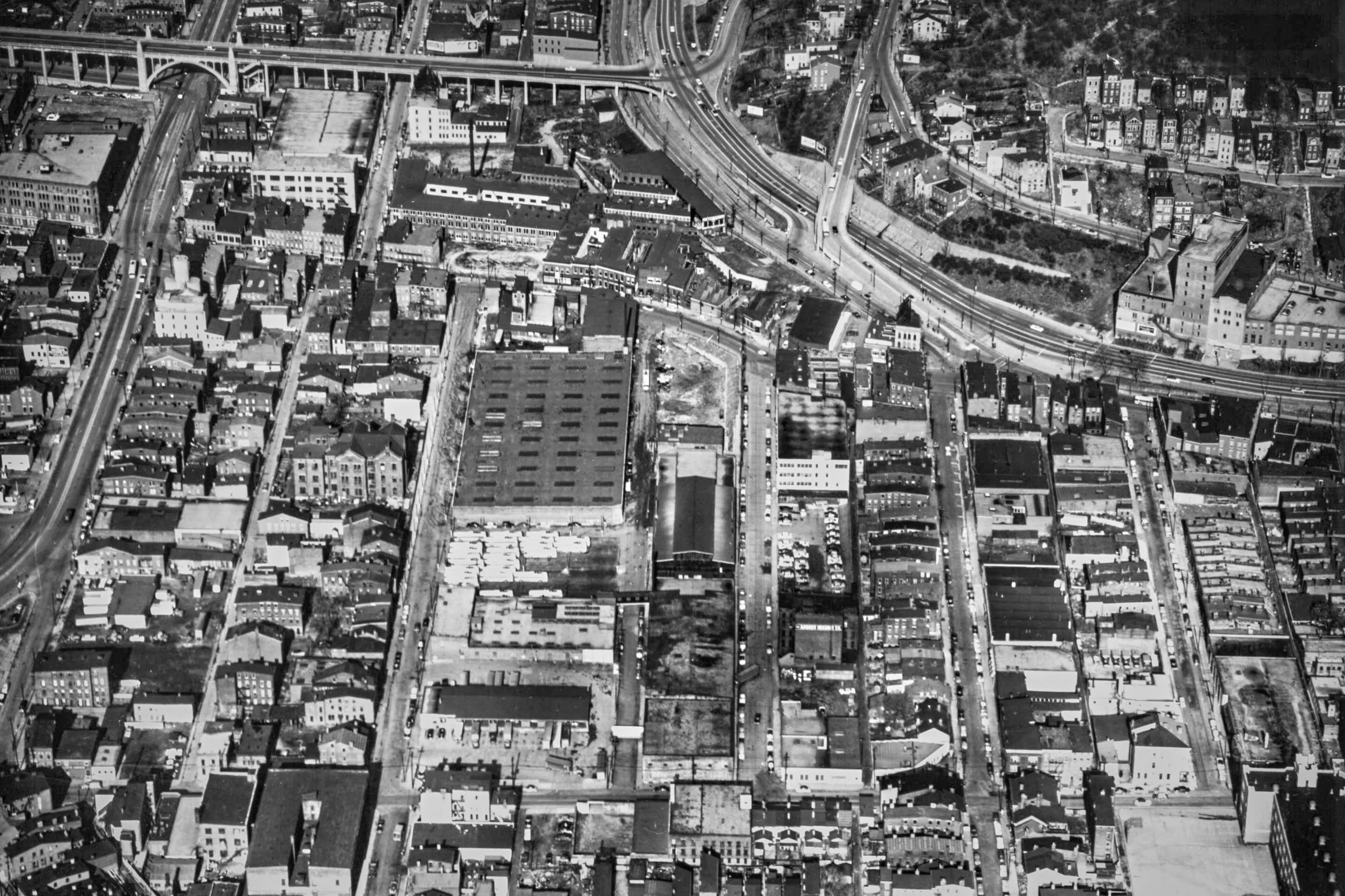 Historic aerial photo of Brighton, looking north. Central Parkway is curving from the right to top, and the Western Hills Viaduct is at the top left with Spring Grove Avenue at left. The Brighton carbarn is the large building at center left.