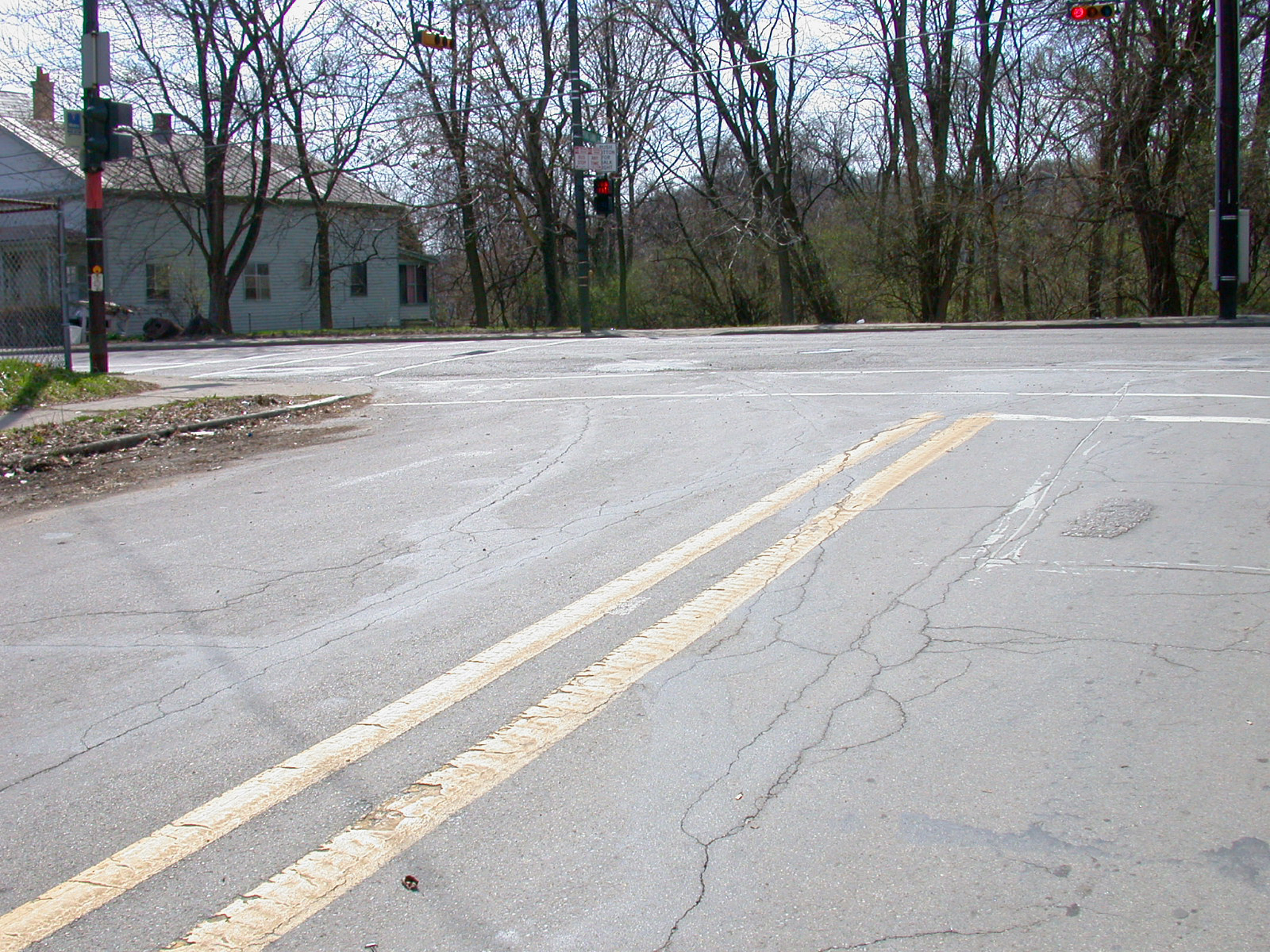 Cracks in the street reveal the Hamilton/Springlawn wye in northern Cumminsville, looking southwest towards Hamilton Avenue.
