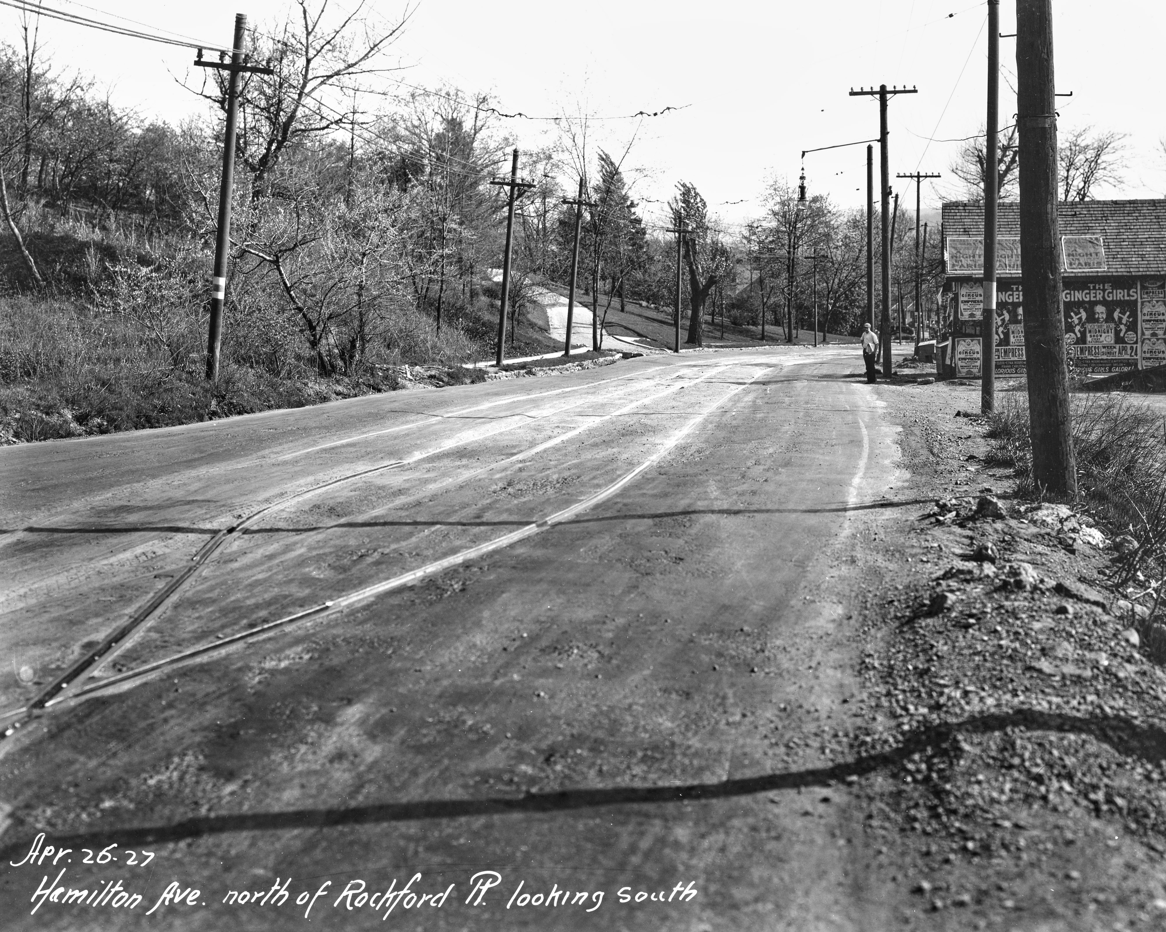 Historic photo of Hamilton Avenue, looking south towards Rockford Place. The tracks move from the middle of the street here to the side of the street, and they also cross so that northbound cars would be on the left side and southbound cars on the right. This was because of the steep grade and sharp drop off to the west side of the street. If a southbound car lost control going downhill and derailed, it would have the rest of the street to run out on rather than being right at the edge of a cliff. Upon reaching Belmont Avenue, the northbound car stayed on Hamilton and moved to the middle of the street, while the southbound track veered over to Belmont. From the University of Cincinnati Library Digital Resource Commons, Street Construction and Improvements collection.