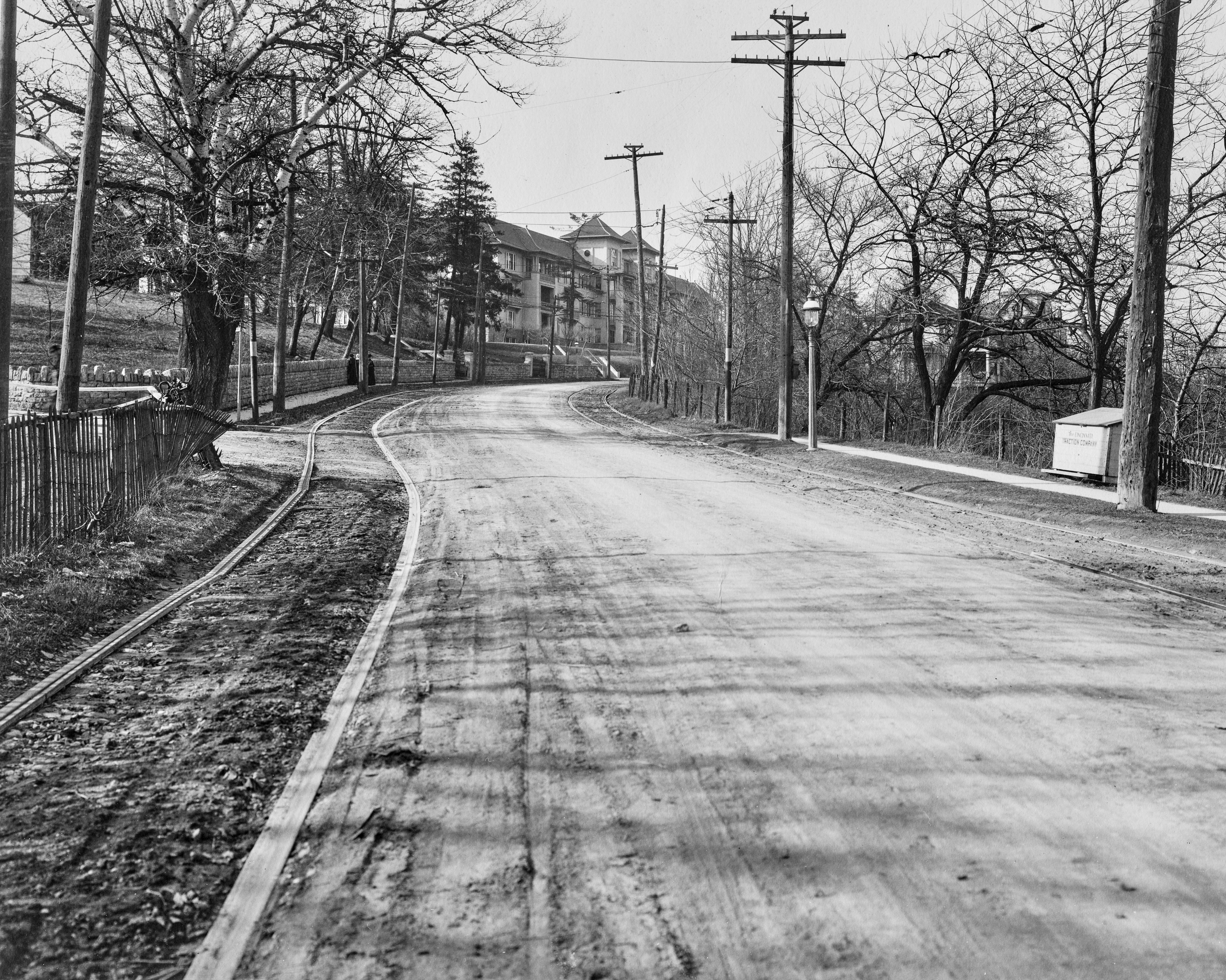 Historic photo of Hamilton Avenue at the Twin Towers Senior Living Community, formerly the Methodist Home for the Aged, looking north north-east at the current main entrance. Windermere Way is behind the fence to the left. The building ahead is no longer there. The box at the right, which reads "The Cincinnati Traction Company" is likely a sand box which the motorman would use to refill his onboard sand store for use when tracks were slippery. From the University of Cincinnati Library Digital Resource Commons, Street Construction and Improvements collection.