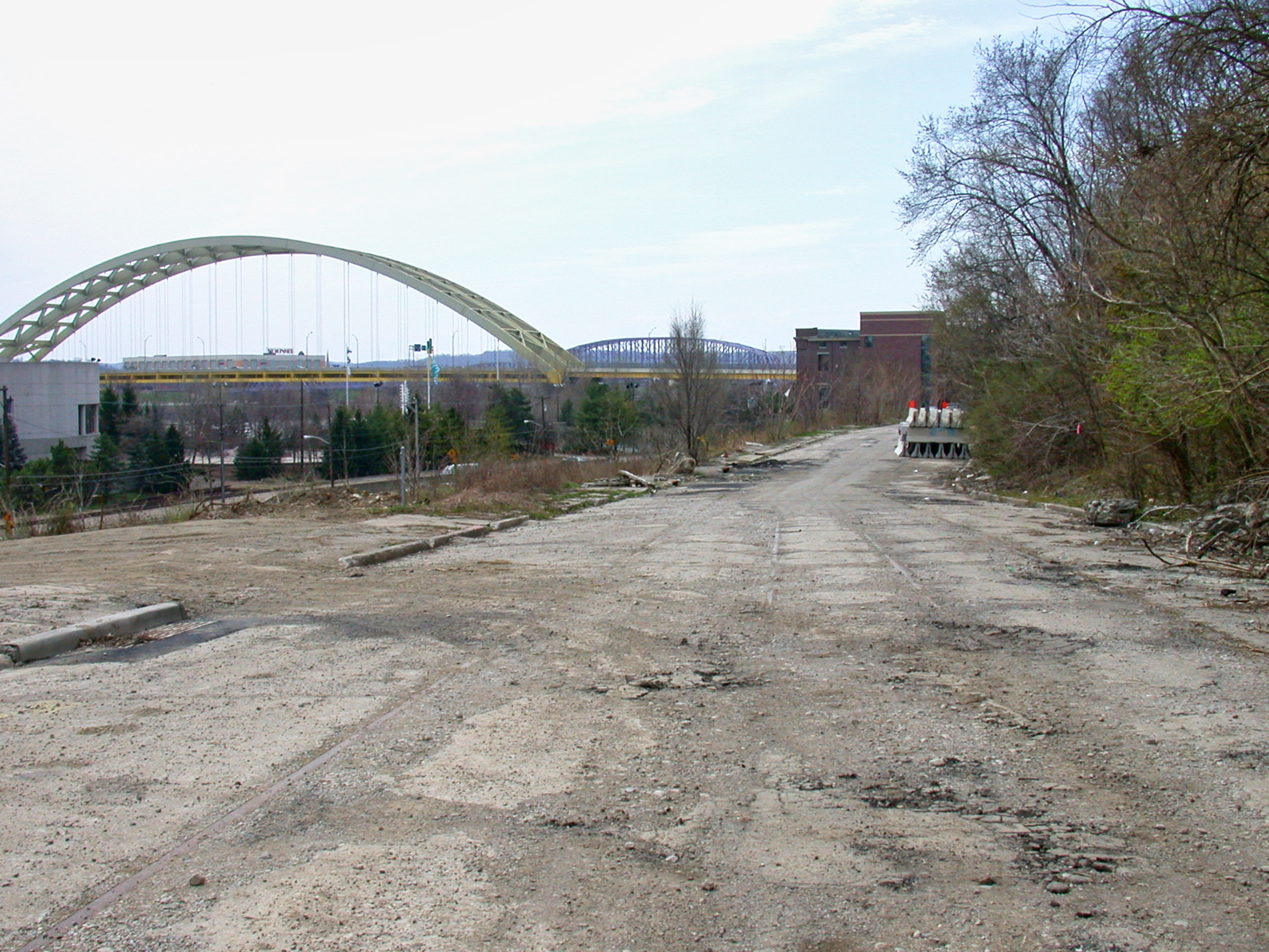 Streetcar tracks on Adam's Crossing (Martin Street) on the east side of downtown, looking west. Columbia Parkway ramp construction vehicles cut down to the left to a lot on Eastern Avenue below. The I-471 Daniel Carter Beard (Big Mac) Bridge is visible in the distance, with the L&N (Purple People) Bridge behind it.