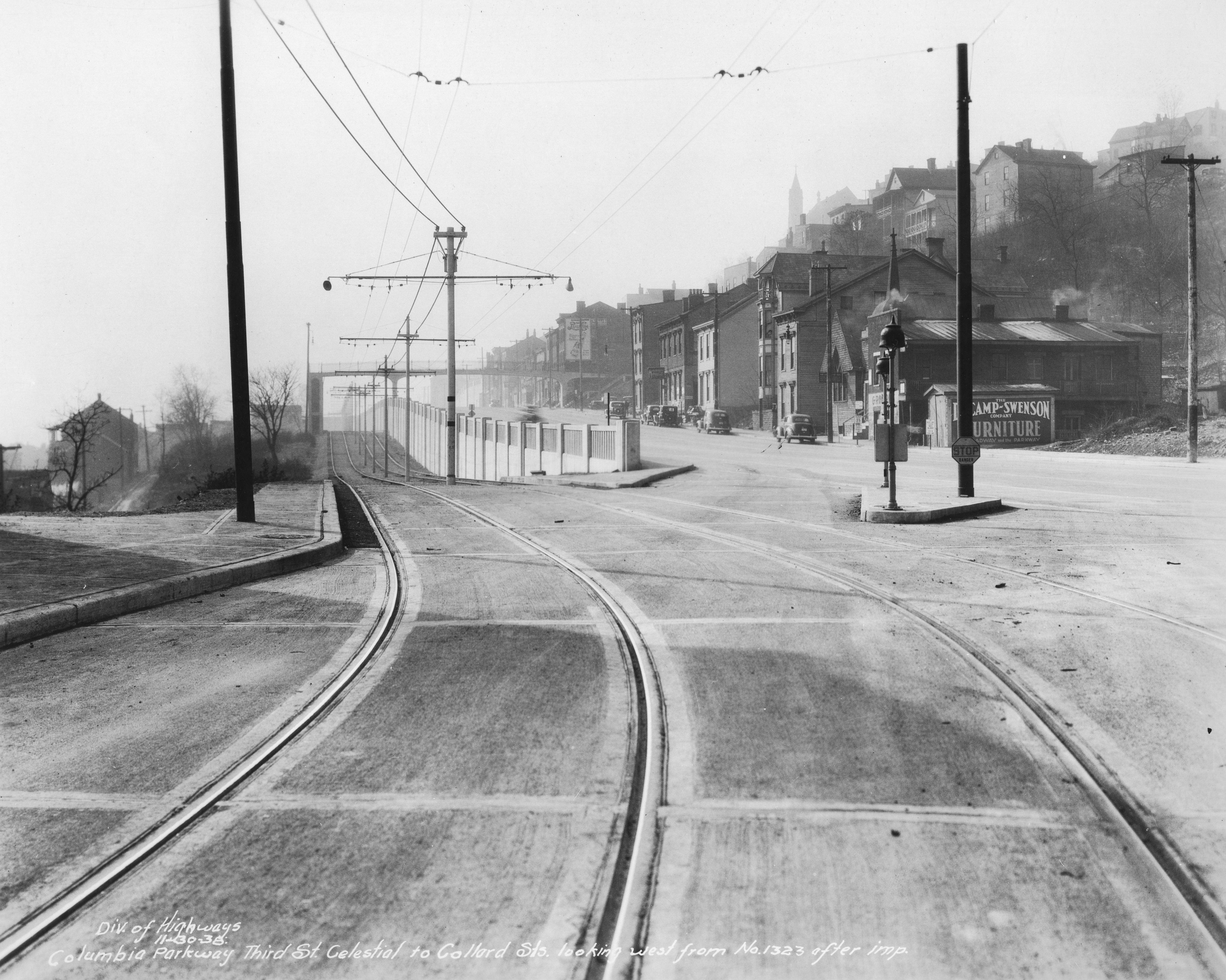Historic photo of Columbia Parkway at Bains Street, showing the private streetcar right-of-way, looking southwest. From the University of Cincinnati Library Digital Resource Commons, Street Construction and Improvements collection.