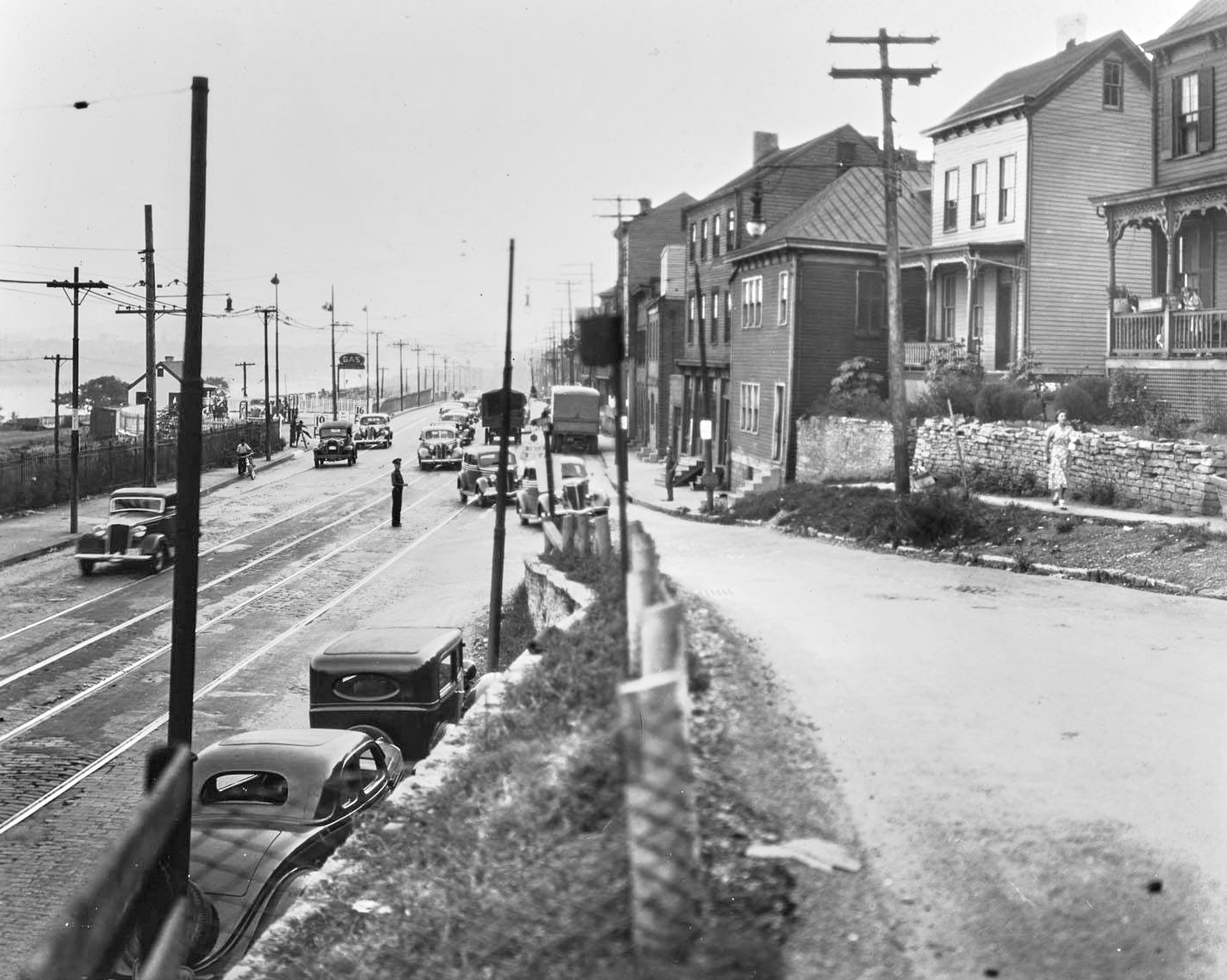 Historic photo of Eastern Avenue at Kemper Lane, looking southwest. Every building in this photo is gone. From the University of Cincinnati Library Digital Resource Commons, Street Construction and Improvements collection.