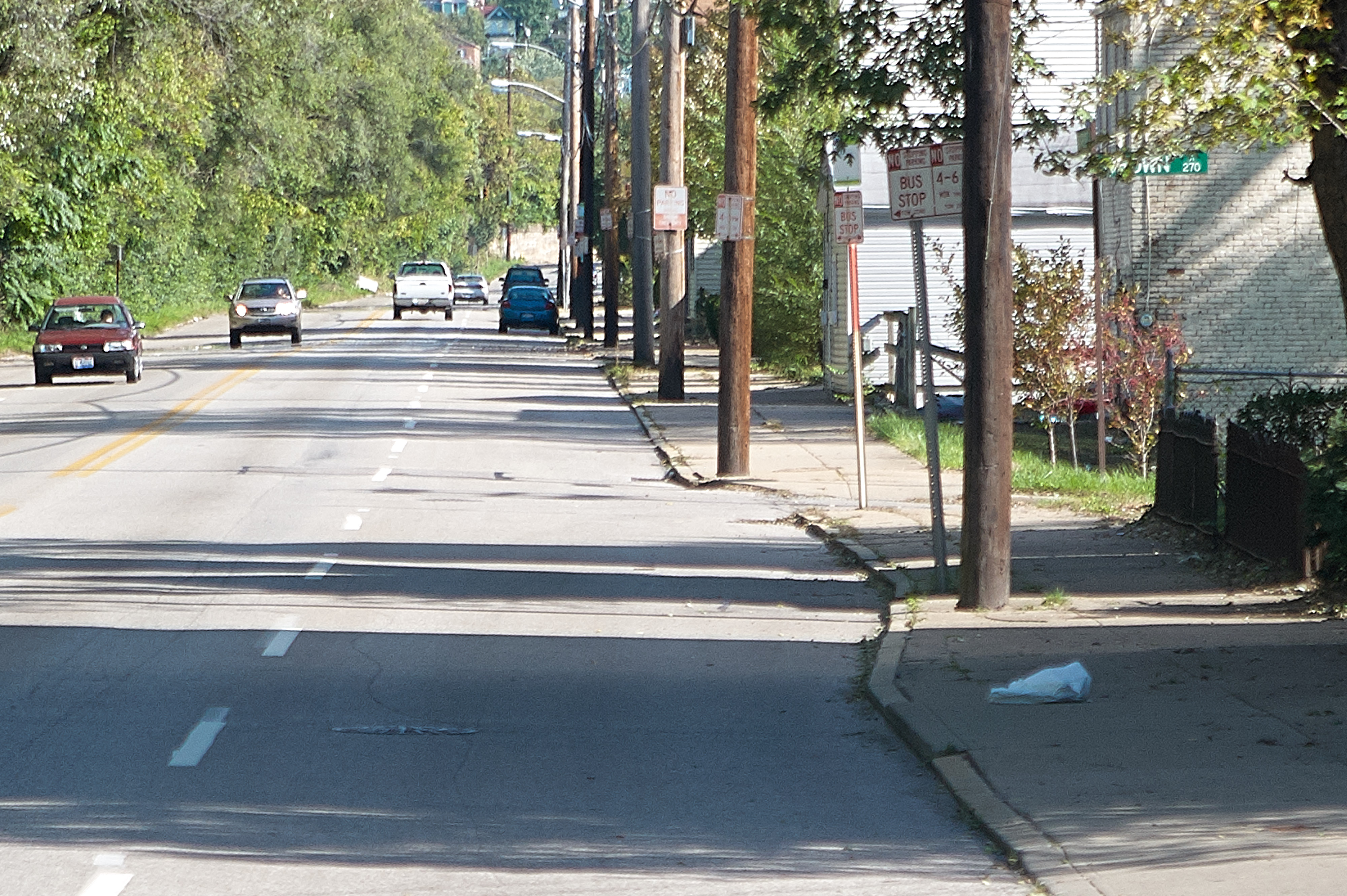 Streetcar stop along Eastern Avenue/Riverside Drive at Brown Street in the East End, looking east. Note how obviously the curb bumps out here. Newer bus stops along this same road add a full lane for the bus to pull into.