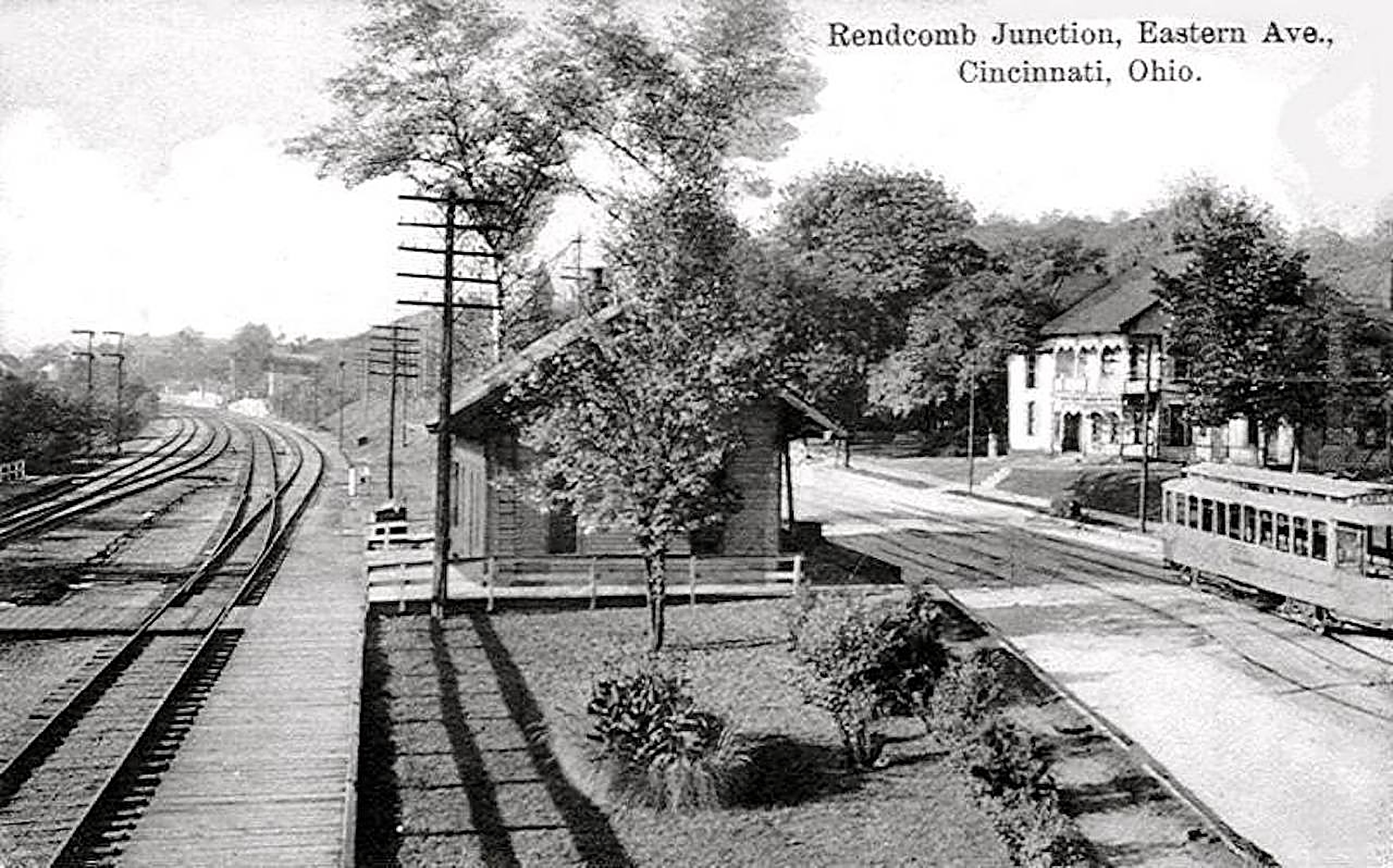 Historic photo of Rendcomb Junction on the Pennsylvania/Little Miami Railroad and the end of the east end streetcar line at Eastern and Archer Avenues in Linwood, looking southwest. There's no ramps to Columbia Parkway and a bus turnaround to the right.