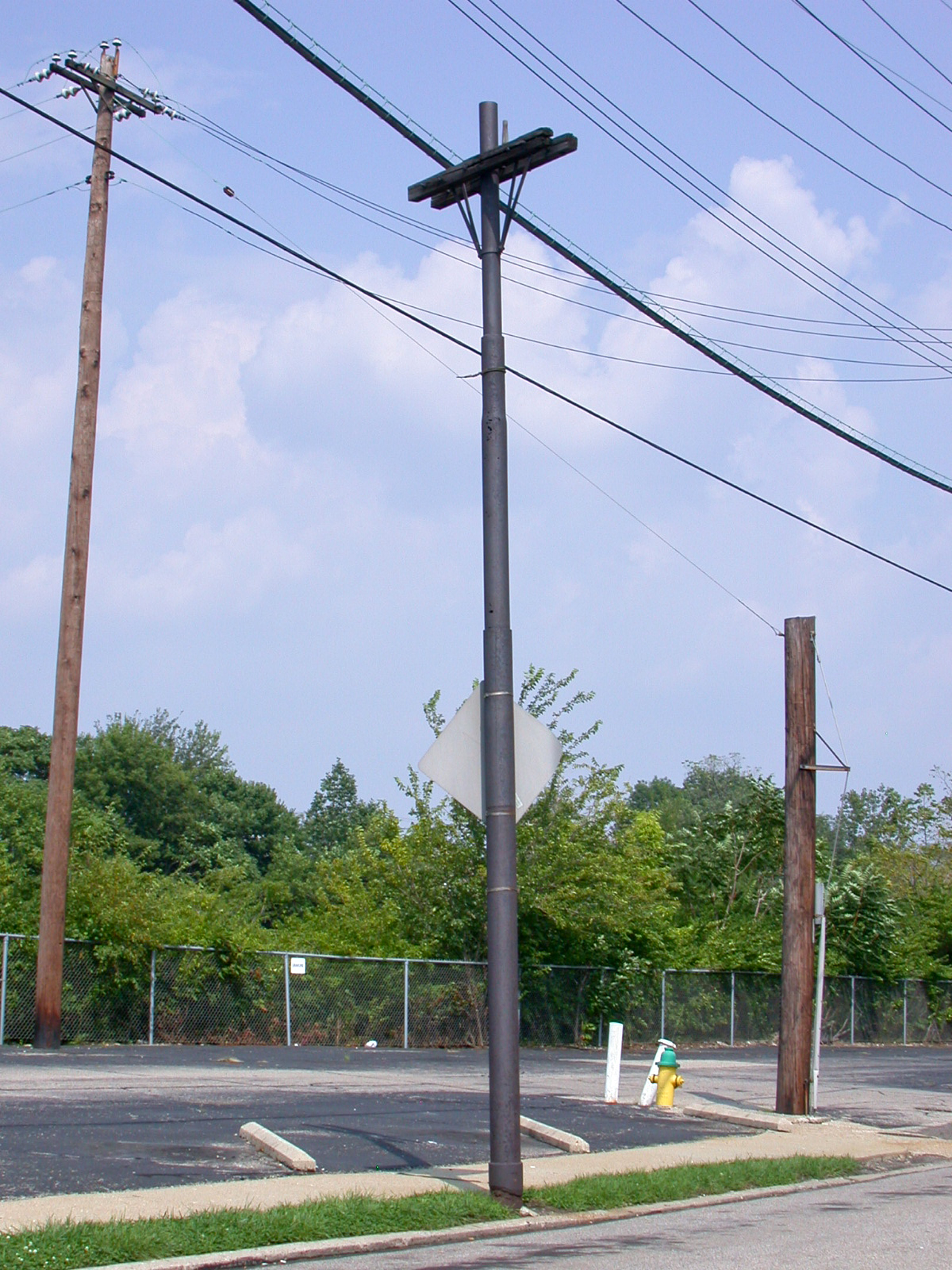 A trolley pole on Harris Avenue in Norwood, looking northeast. A few poles around the area still have their wire supports, but few are still used. In the mid to late 2010s most of this street and all the buildings have been demolished.