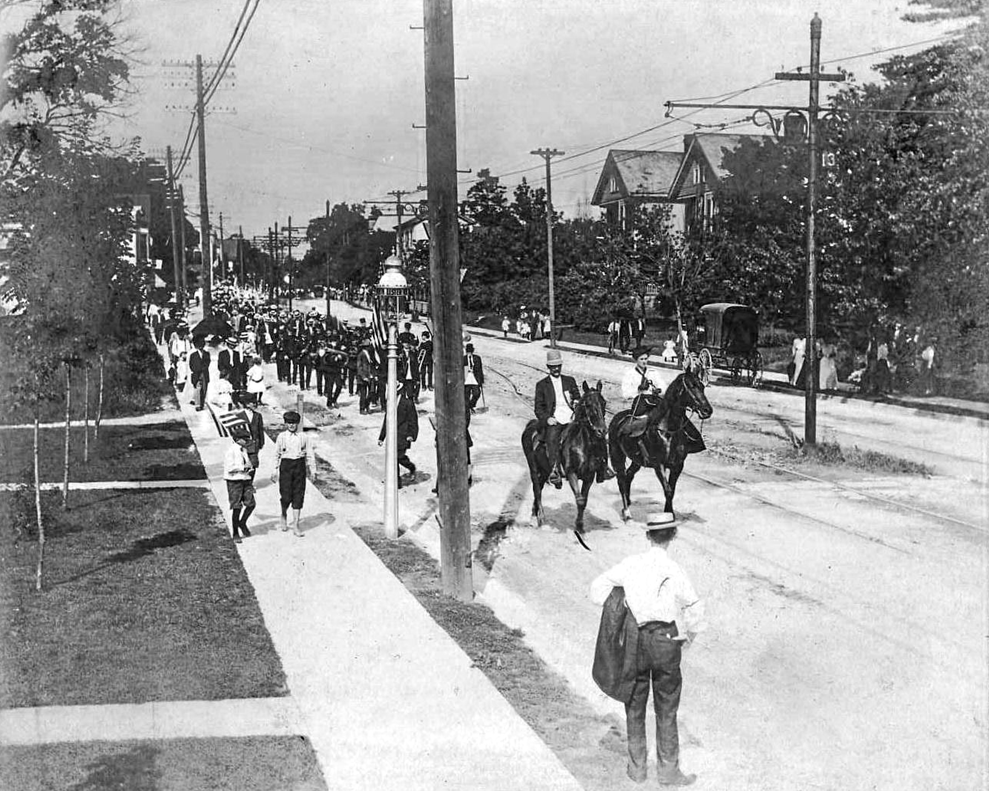 Historic photo of IR&T Rapid Railway tracks on Montgomery Road at Lester Road in Pleasant Ridge, looking east from in front of the Pleasant Ridge School around the turn of the 20th century. Note the poles supporting the wires in the middle of the street. At this time this would have been the IR&T Rapid Railway's tracks.