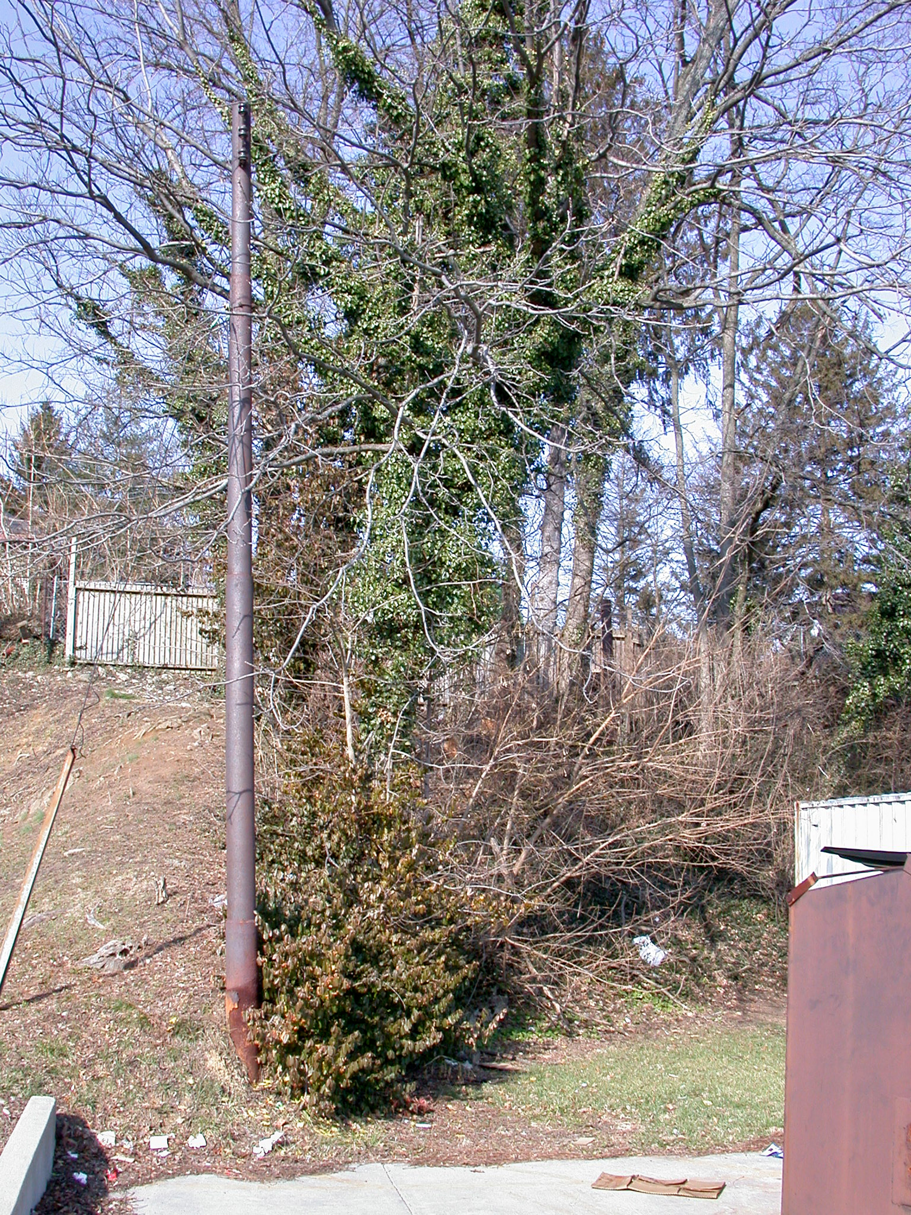 A trolley pole and retaining wall at the rear of the Kennedy Heights loop on Montgomery Road, looking north. While the Family Dollar store has obliterated most of the loop's remains, the poles and wall along the back of the property were left intact.