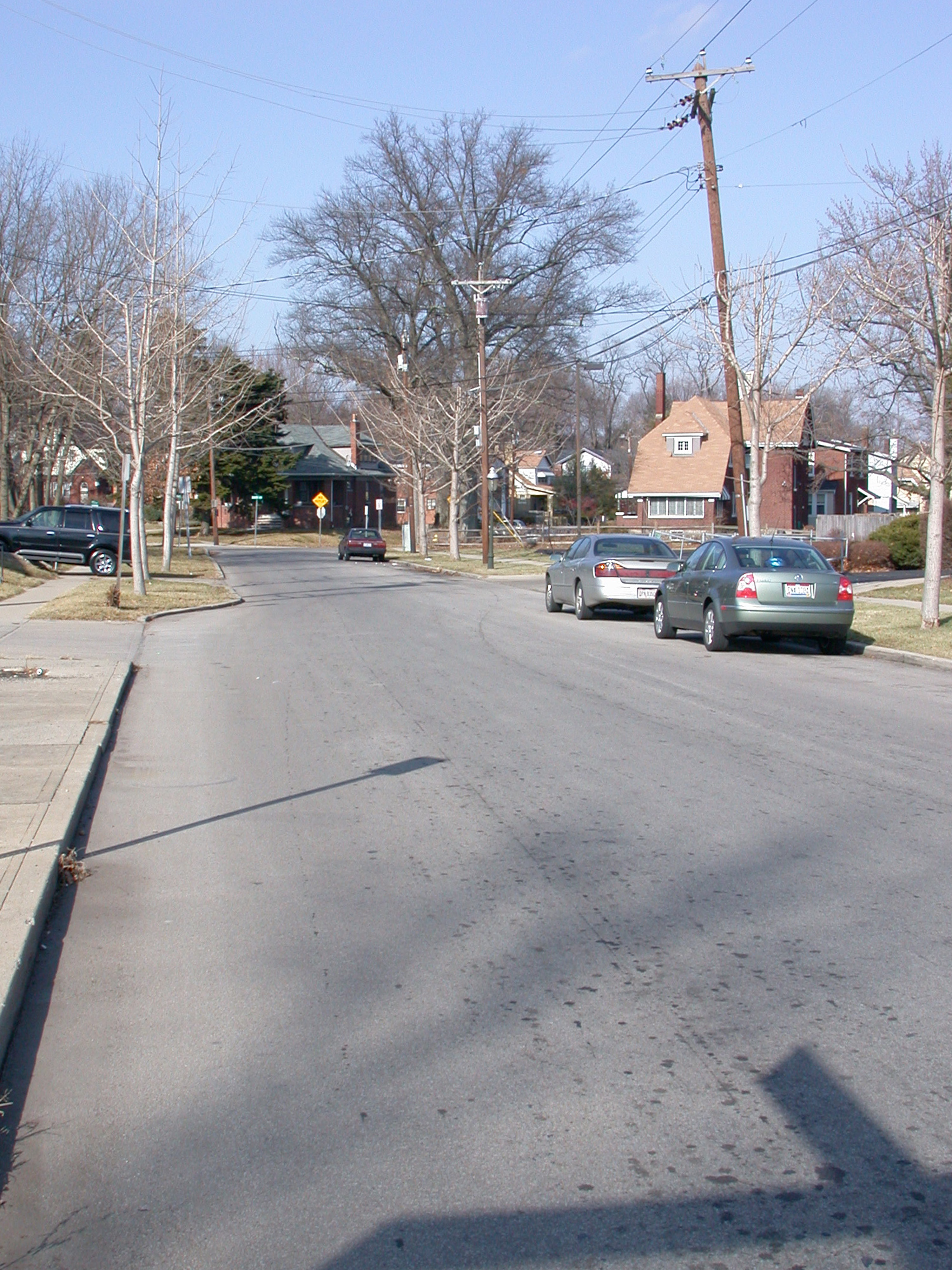 Location of the Kennedy Heights wye. While there are no tracks visible underneath this new pavement, the wide area of Kennedy Avenue here, looking north from Montgomery Road in Kennedy Heights, reveals how far down the road this leg of the wye extended. The other end of the wye went several blocks down Montgomery Road to Coleridge at the city limits. This was cut back to the loop at the Family Dollar in later years.