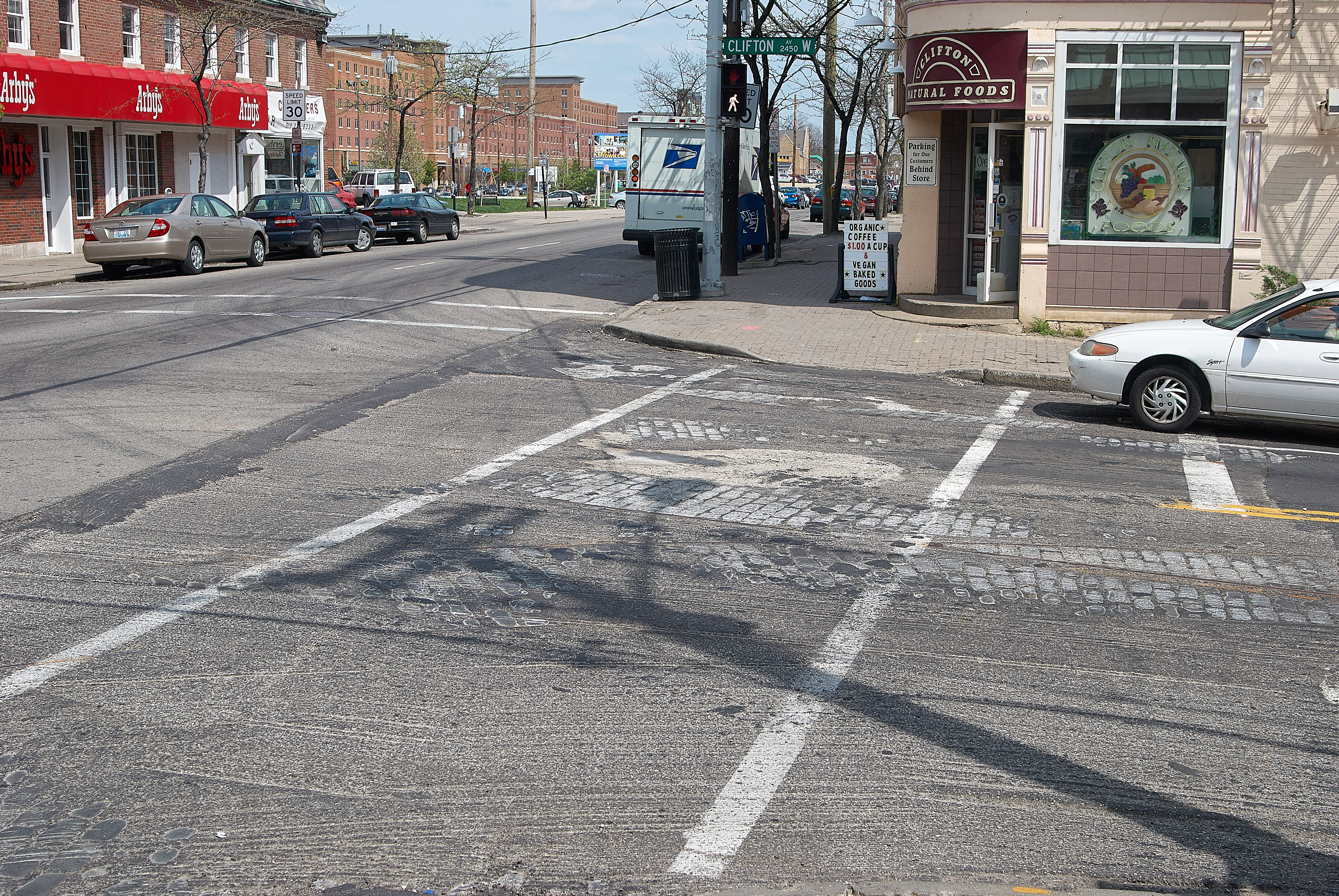 Revealed tracks and granite block paving at Clifton and McMillan in Fairview/Clifton Heights, looking northeast towards UC.