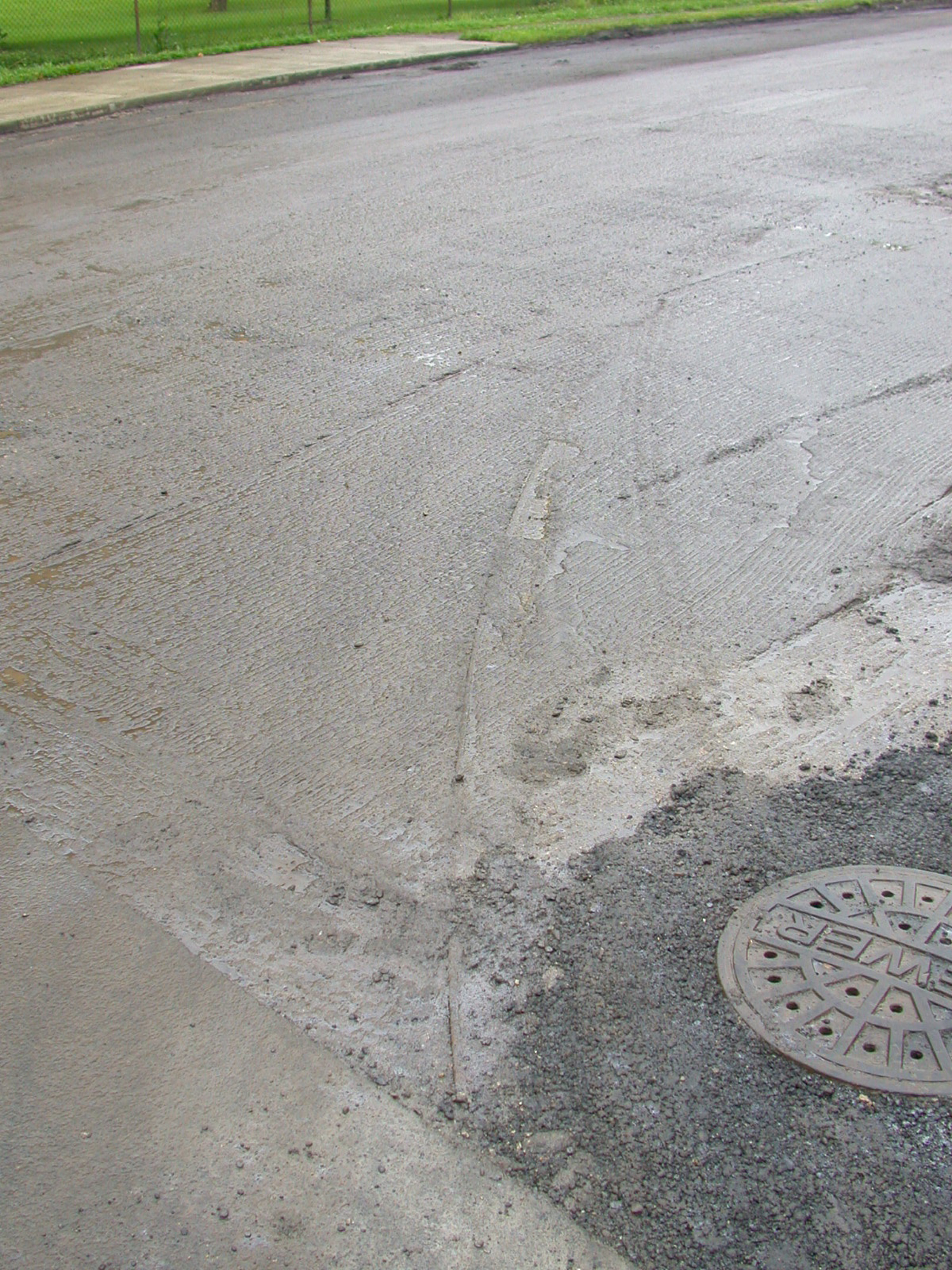 Close up of the McAlpin wye in Clifton, looking east from Middleton Avenue. The curve of the track from Middleton onto McAlpin is apparent here, and it caused some very noticeable cracking in the layer of asphalt that was removed.