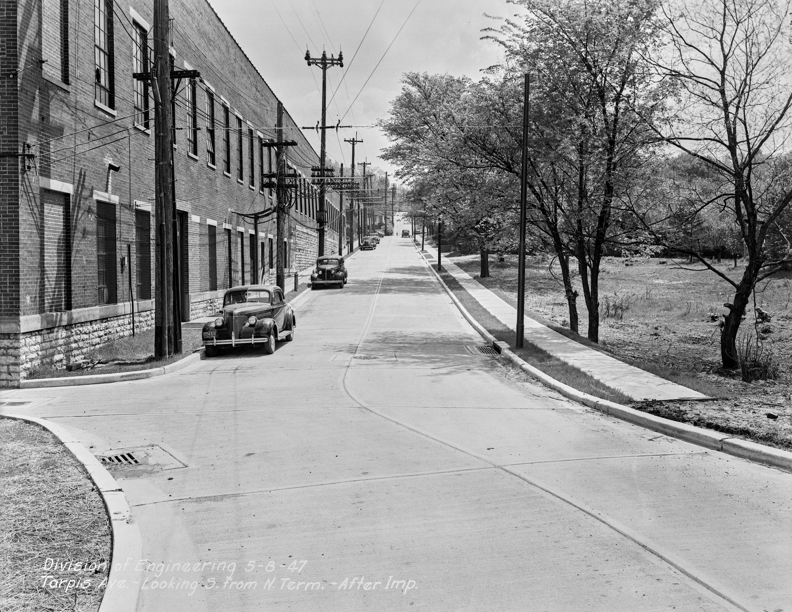 Historic photo of Tarpis Avenue and the Hyde Park Carbarns, looking south from near the end of the street. The little turnout with the drain in the middle of it at the extreme left remains to this day. From the University of Cincinnati Library Digital Resource Commons, Street Construction and Improvements collection.