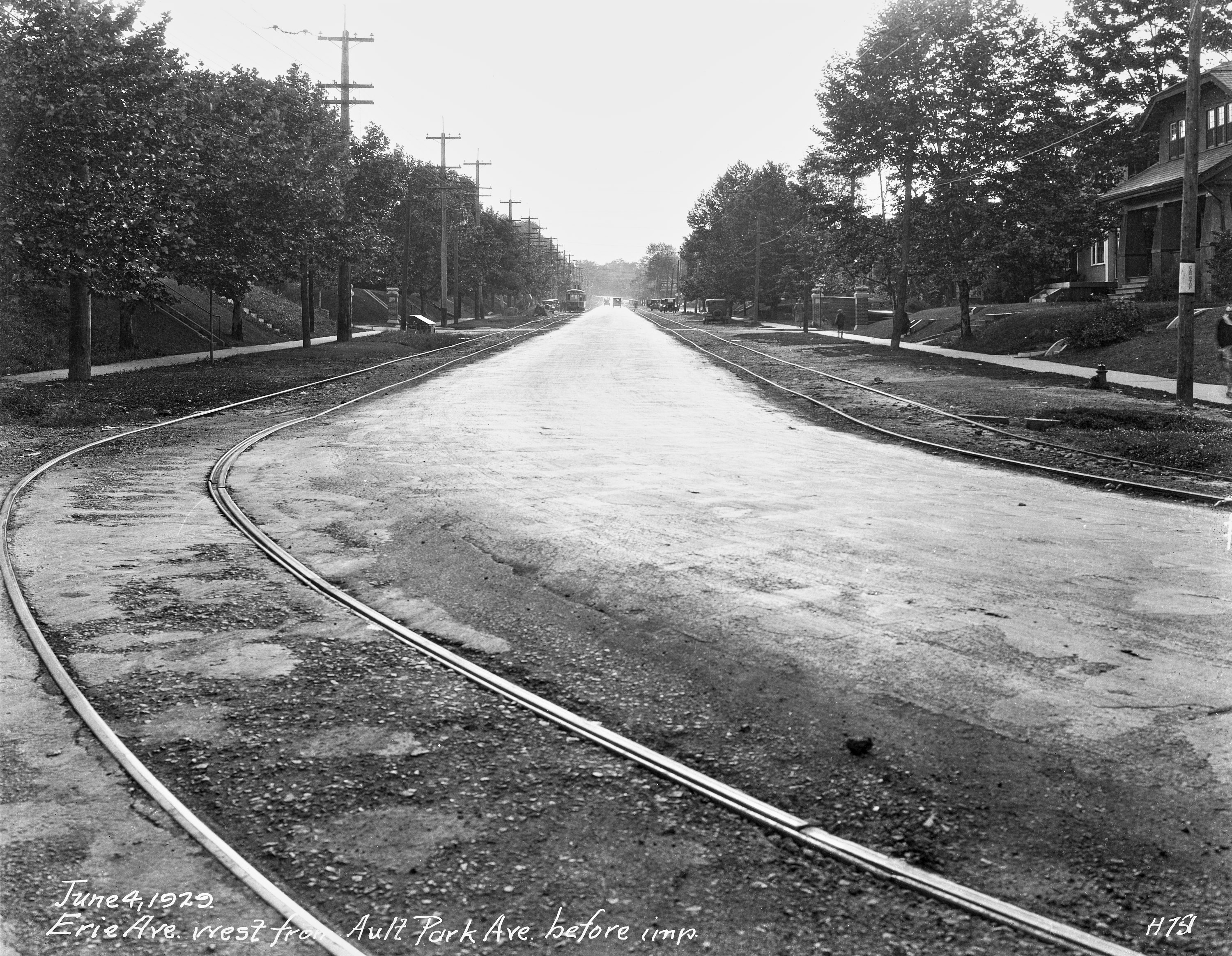 Historic photo of Erie Avenue at Ault Park Avenue in East Hyde Park, looking west. From the University of Cincinnati Library Digital Resource Commons, Street Construction and Improvements collection.